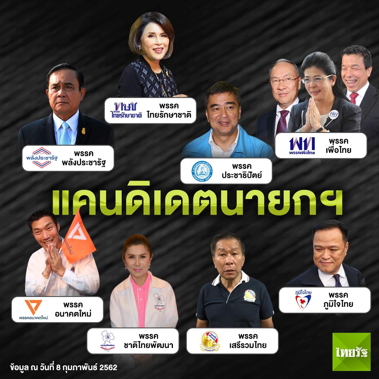 วันที่ 8 ก.พ.62 ผู้สื่อข่าวรายงานว่า เนื่องจากวันนี้เป็นสุดท้ายของการเปิดให้พรรคต่างๆ เดินทางเข้ายื่นบัญชีรายชื่อนายกรัฐมนตรีของพรรคฯ ต่อคณะกรรมการการเลือกตั้ง (กกต.) เป็นวันสุดท้ายนั้น ทีมข่าวไทยรัฐออนไลน์ได้รวบรวมรายชื่อผู้ที่ถูกเสนอชื่อเป็นนายกรัฐมนตรี ดังนี้