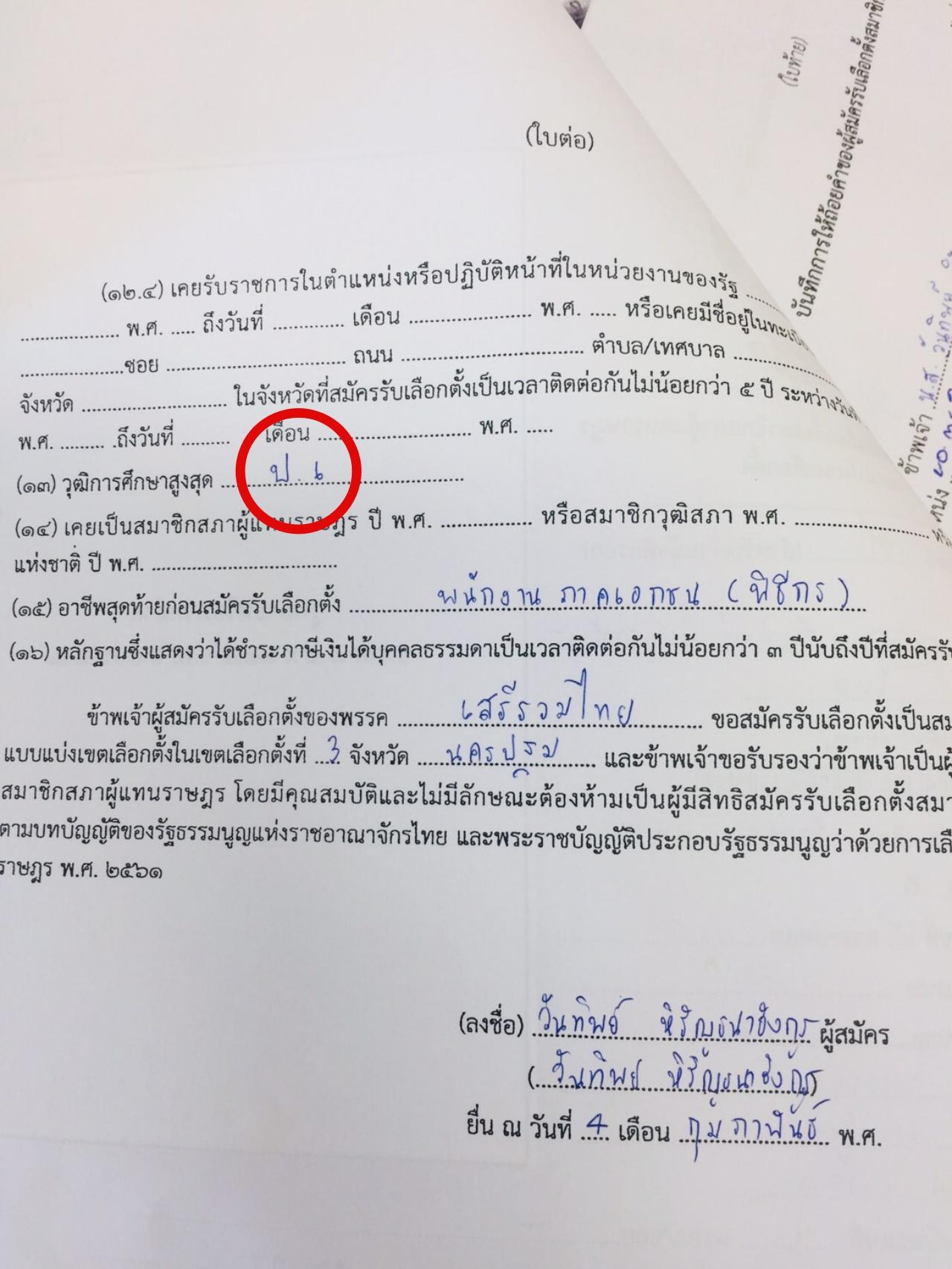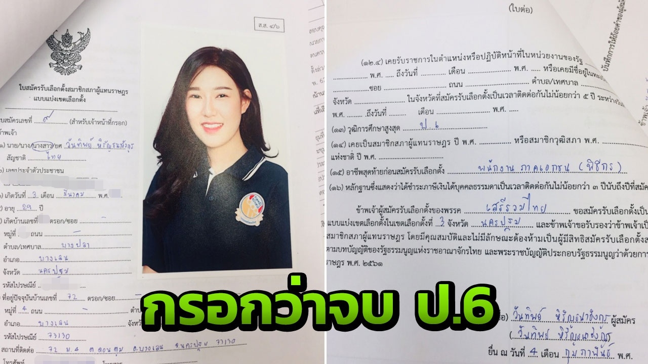 กกต.เปิดเอกสารยื่นสมัคร ส.ส.พบ "วันทิพย์ หิรัญธนาอังกูร" ผู้สมัครพรรคเสรีรวมไทย ระบุชัดเองว่า วุฒิการศึกษาสูงสุด ป.6 ดังนั้นข้อมูลในเอกสารแจ้งเจ้าบ้าน จึงยึดตามเอกสารใบสมัคร...