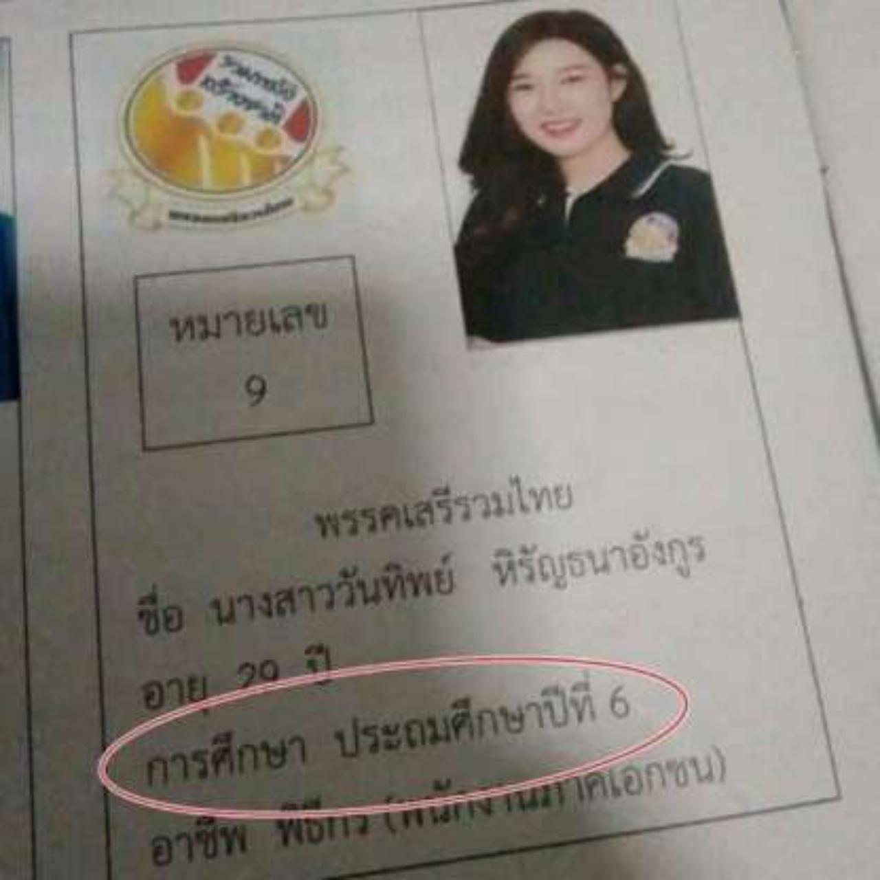 จากกรณีที่มีการเผยแพร่ภาพผู้สมัครพรรคเสรีรวมไทย น.ส.วันทิพย์ หิรัญธนาอังกูร ผู้สมัครเขต 3 จ.นครปฐม พรรคเสรีรวมไทย มีวุฒิการศึกษาระดับ ป.6 ซึ่งอันที่จริงแล้ว กำลังเรียนต่อปริญญาโทอยู่ และไม่ได้จบประถม 6 อย่างในภาพ