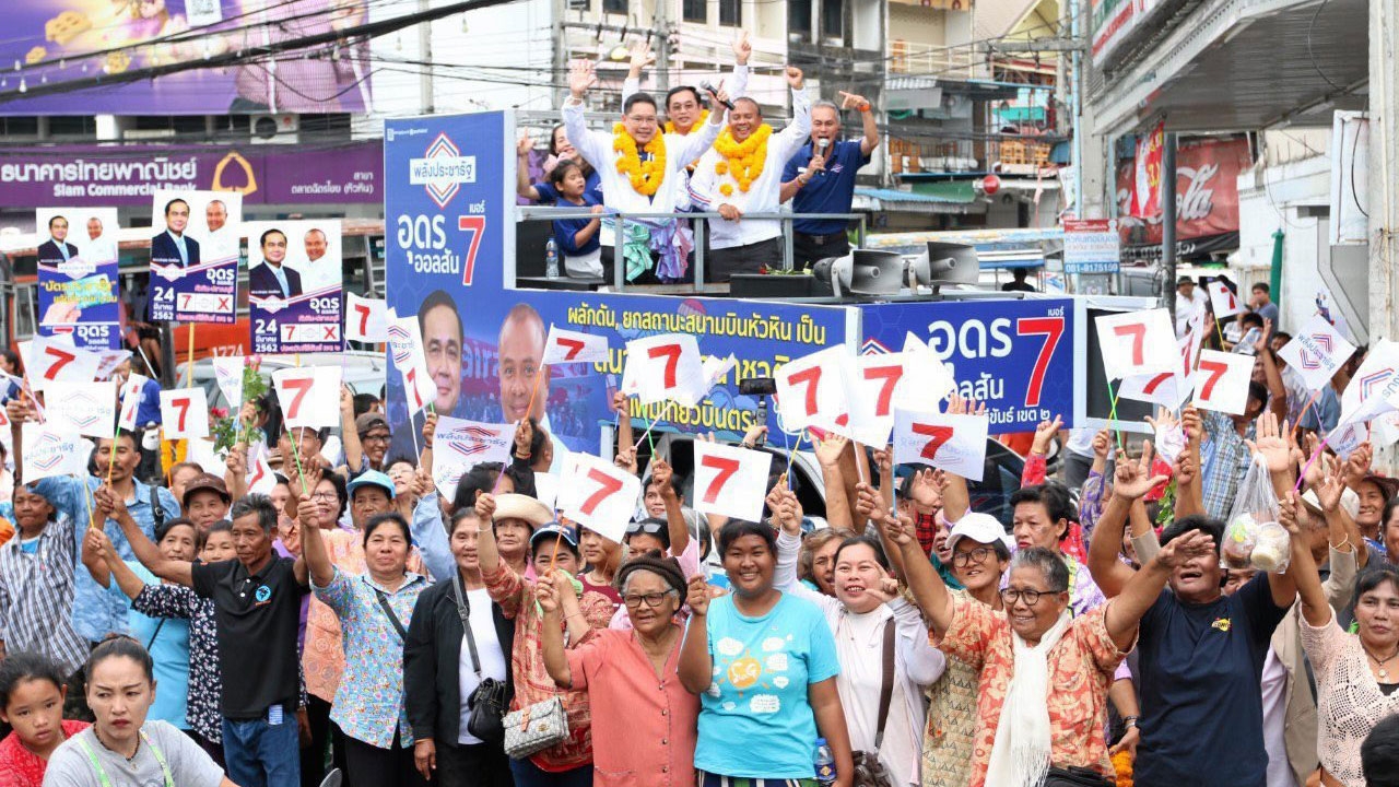 นายอุตตม สาวนายน หัวหน้าพรรคพลังประชารัฐ และนายอนุชา นาคาศัย ประธานยุทธศาสตร์การเลือก ตั้งภาคกลาง ขึ้นรถปราศรัยที่ตลาดสดฉัตรชัย จ.ประจวบคีรีขันธ์ เร่งเครื่องหาเสียงช่วยผู้สมัครพรรคในโค้งสุดท้าย.