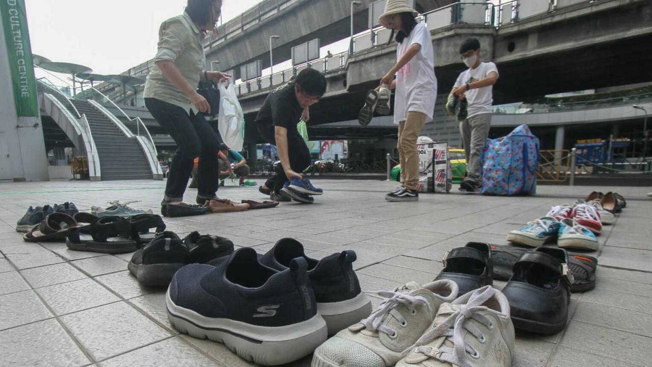 เนติวิทย์และพวก จัดแสดงศิลปะ ชื่อ "สหบาทา กกต." เอารองเท้าร้อยคู่มาเรียงกันเป็นอักษร กกต.หน้าหอศิลป์ กทม. ด้าน นายพริษฐ์ หรือ เพนกวิน เผย กกต.ส่งตัวแทนเข้าแจ้งความข้อหาหมิ่นประมาทแล้ว