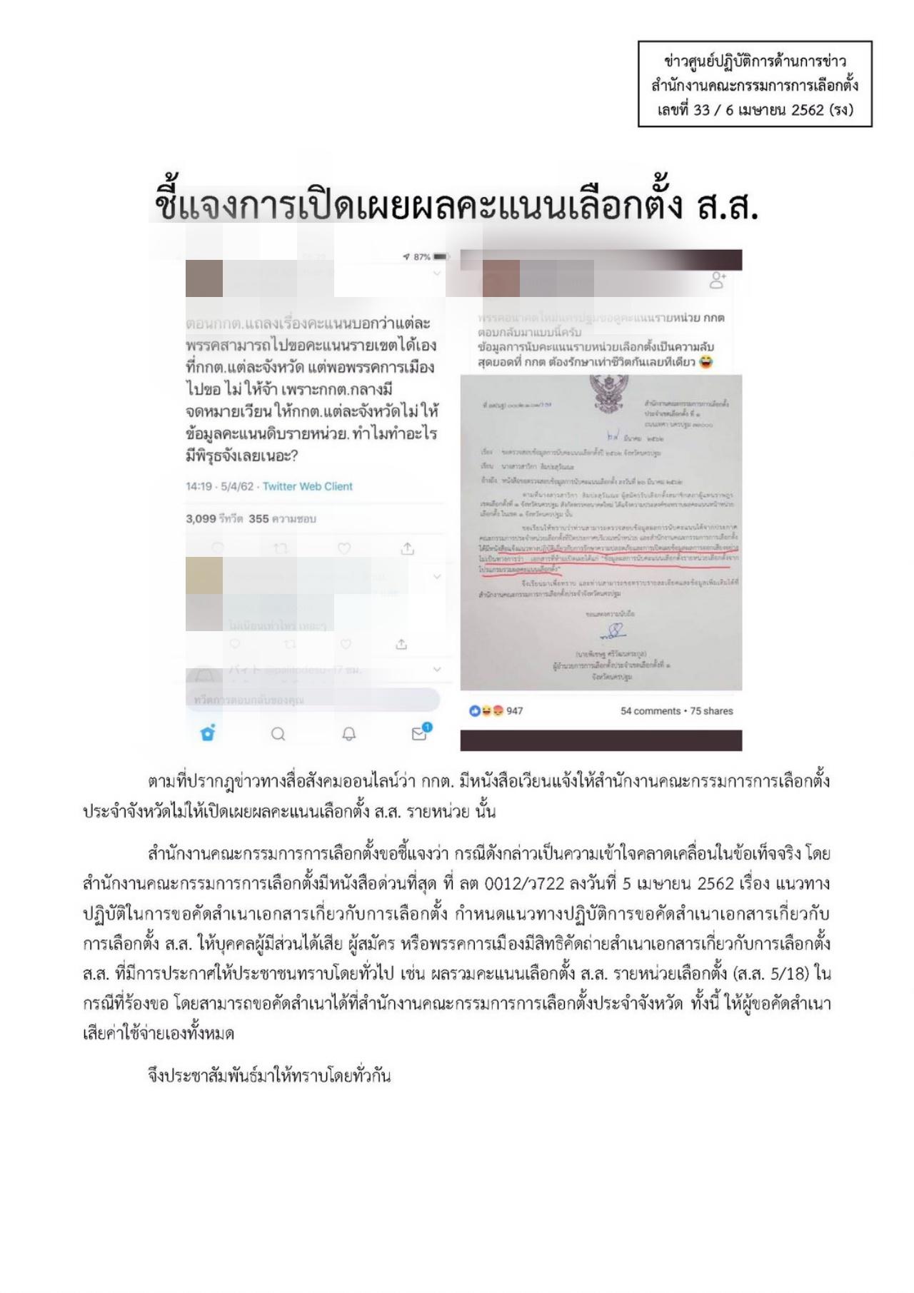 พร้อมกันนี้ ยังชี้แจง กรณีที่ปรากฏข่าวปล่อยแพร่ในสื่อสังคมออนไลน์ ว่า กกต. มีหนังสือเวียนแจ้งให้ กกต.จังหวัด ไม่ให้เปิดเผยผลคะแนนเลือกตั้งรายหน่วยนั้นว่า เป็นความเข้าใจคลาดเคลื่อนในข้อเท็จจริง โดยข้อเท็จจริง กกต. มีหนังสือด่วนที่สุด ลต.0012/ว722 ลงวันที่ 5 เมษายน 2562 เรื่อง แนวทางการปฏิบัติในการขอคัดสำเนาเอกสารเกี่ยวกับการเลือกตั้ง กำหนดให้บุคคลผู้มีส่วนได้เสีย ผู้สมัคร หรือพรรคการเมือง มีสิทธิ์คัดถ่ายสำเนาเอกสารเกี่ยวกับการเลือกตั้ง ที่มีประกาศให้ประชาชนรับทราบทั่วไป เช่น ผลรวมคะแนนเลือกตั้ง ส.ส.รายหน่วย ตามที่มีการร้องขอ ทั้งนี้ผู้ขอคัดสำเนาเสียค่าใช้จ่ายเองทั้งหมด