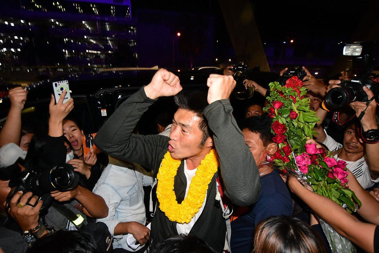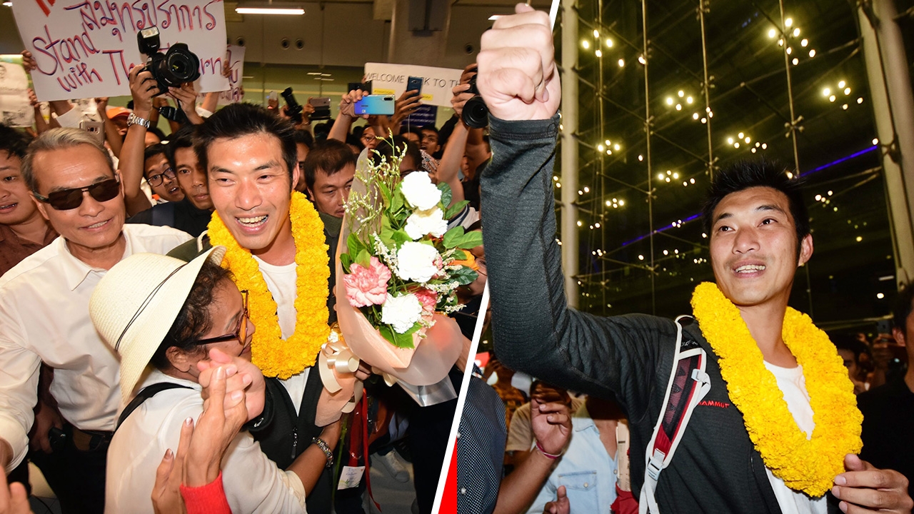 คํ่าวันเดียวกัน เมื่อเวลา 20.00 น. ที่หน้าประตู 7 อาคารผู้โดยสารขาเข้าระหว่างประเทศ สนามบินสุวรรณภูมิ นายธนาธรได้เดินทางกลับจากประเทศเนเธอร์แลนด์ โดยมีบรรดากองเชียร์และผู้สนับสนุนพรรคอนาคตใหม่แห่ไปต้อนรับกันเป็นจำนวนมาก ทันทีที่นายธนาธรเดินออกมาถึง กองเชียร์พากันเข้ามอบดอกกุหลาบแดงเป็นกำลังใจ พร้อมตะโกนส่งเสียงเชียร์ “ธนาธรสู้ๆ” เสียงดังก้องไปทั่วบริเวณ