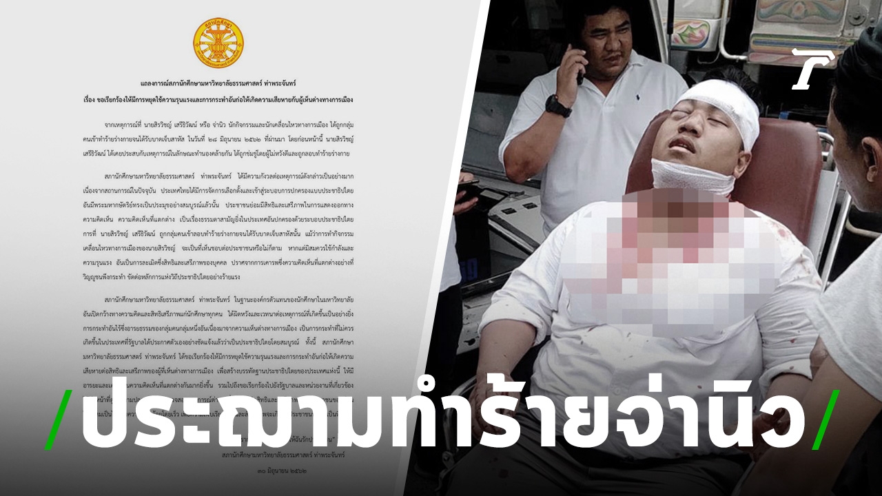 สภานักศึกษา ม.ธรรมศาสตร์ ท่าพระจันทร์ หยุดใช้ความรุนแรง กับผู้เห็นต่างทางการเมือง หลัง "จ่านิว" ถูกทำร้ายบาดเจ็บสาหัส พร้อมเรียกร้องรัฐบาลตรวจสอบเหตุการณ์ ดูแลความปลอดภัยประชาชน