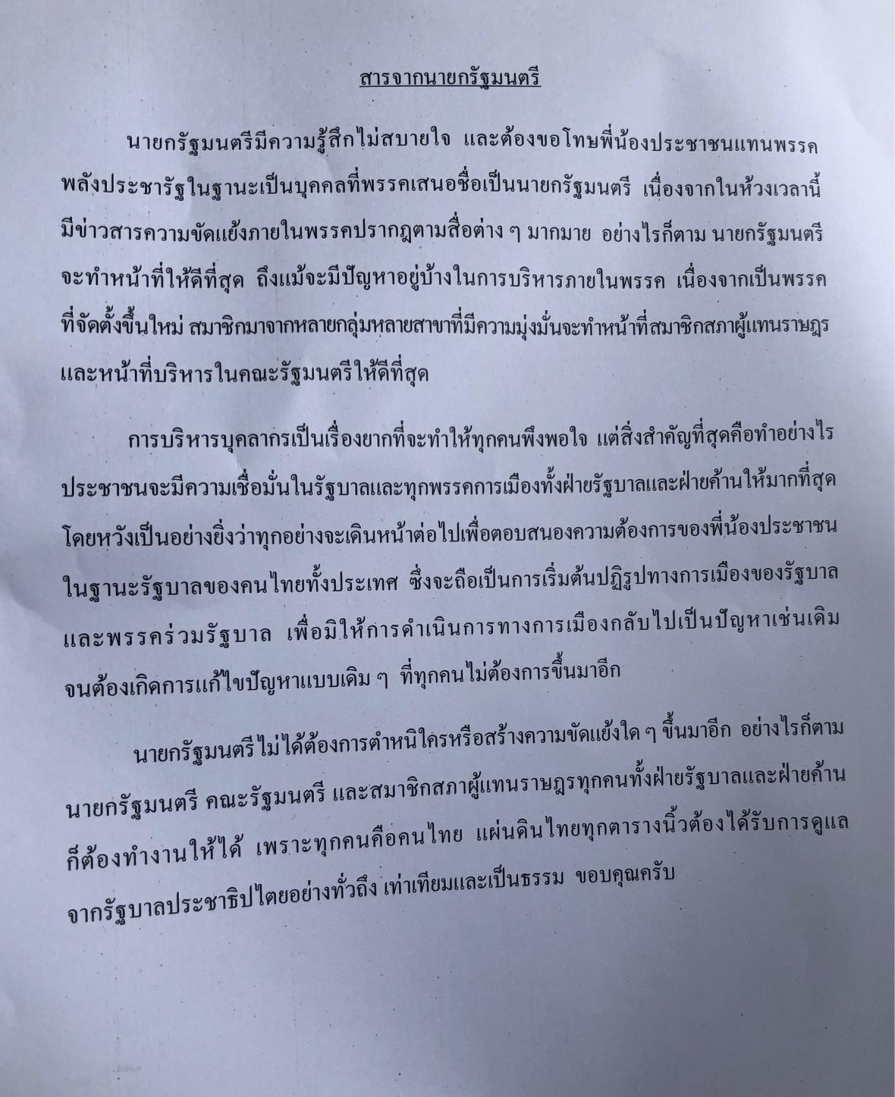 โดยสารดังกล่าว ระบุว่า "นายกรัฐมนตรีมีความรู้สึกไม่สบายใจ และต้องขอโทษประชาชนแทนพรรคพลังประชารัฐ ในฐานะเป็นบุคคลที่พรรคเสนอเป็นนายกรัฐมนตรี เนื่องจากเวลานี้มีข่าวสารภายในพรรคตามที่ปรากฏตามสื่อมากมาย อย่างไรก็ตามนายกรัฐมนตรีจะทำหน้าที่ให้ดีที่สุดแม้ว่าจะมีปัญหาอยู่บ้างในการบริหารภายในพรรค เนื่องจากเป็นพรรคที่จัดตั้งขึ้นใหม่ สาขาสมาชิกมาจากหลายกลุ่มหลายสาขา มีความมุ่งมั่น จะทำหน้าที่สมาชิกสภาผู้แทนราษฎร และหน้าที่บริหารในคณะรัฐมนตรีให้ดีที่สุด
