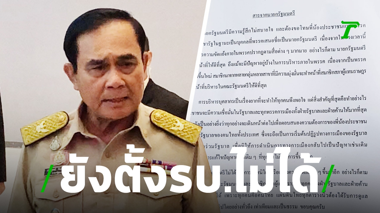 "บิ๊กตู่" ร่อนเอกสารขอโทษประชาชนปมขัดแย้งภายใน "พลังประชารัฐ" ยันจะทำหน้าที่ให้ดีที่สุดในฐานะนายกฯ ขอเชื่อมั่น รบ.-พรรคร่วม ทำงาน เพื่อป้องกันปัญหาวนกลับมาอีก ลั่นไม่อยากตำหนิใครสร้างความขัดแย้ง
