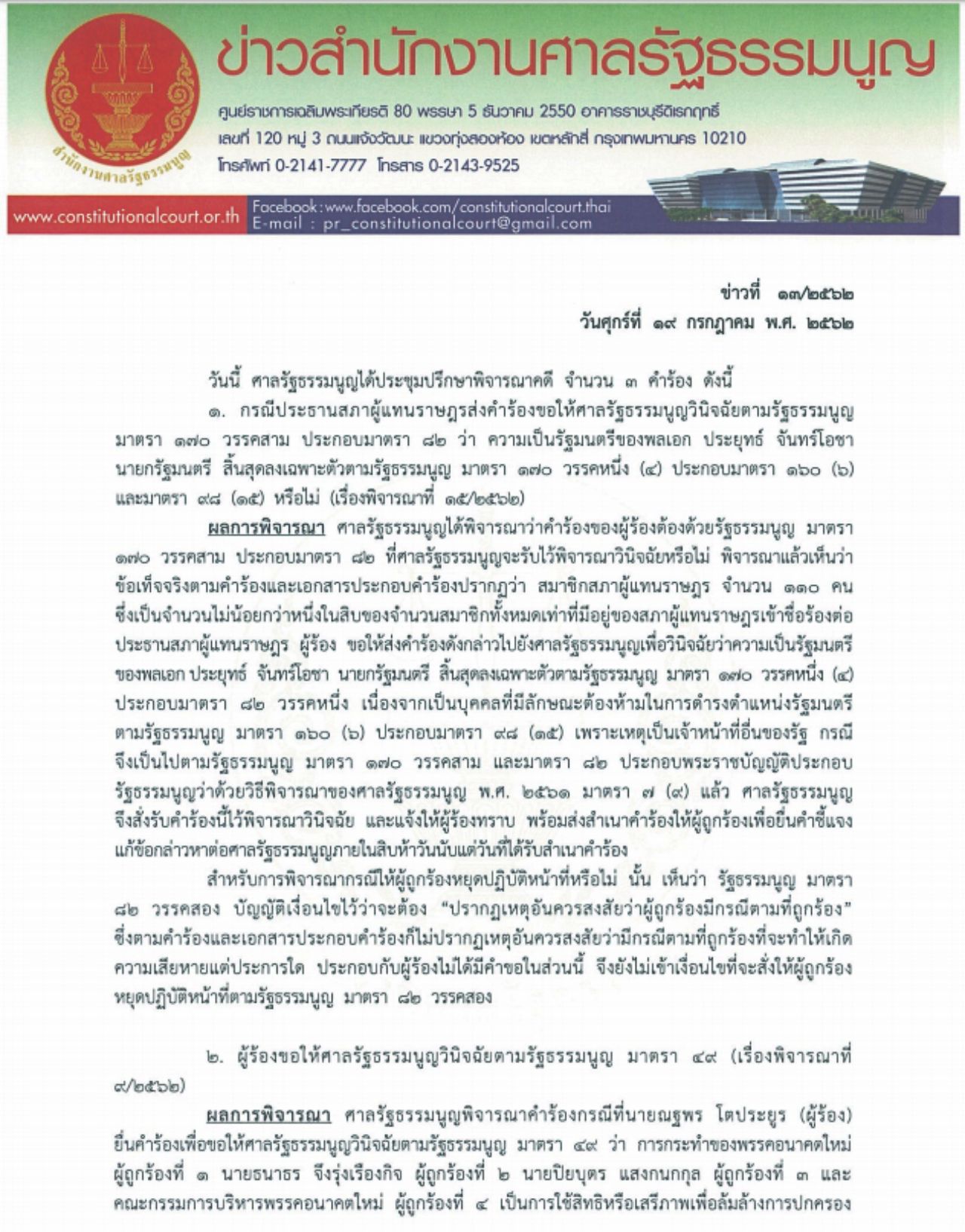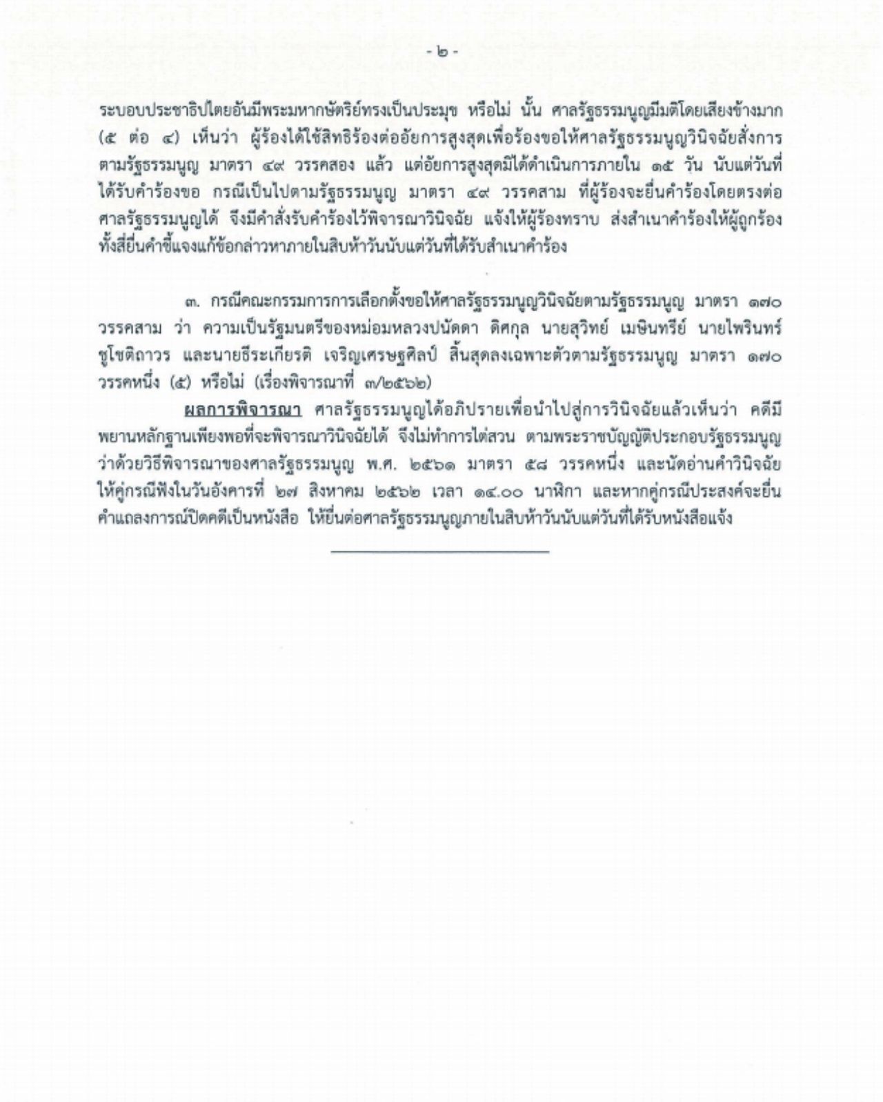 เรื่องที่ 2 ศาลรัฐธรรมนูญ พิจารณาคำร้องกรณีที่ นายณฐพร โตประยูร ยื่นคำร้องขอให้วินิจฉัยว่า การกระทำของพรรคอนาคตใหม่ นายธนาธร จึงรุ่งเรืองกิจ นายปิยบุตร แสงกนกกุล และคณะกรรมการบริหารพรรค เป็นการใช้สิทธิหรือเสรีภาพเพื่อล้มล้างการปกครองระบอบประชาธิปไตยอันมีพระมหากษัตริย์ทรงเป็นประมุขหรือไม่นั้น ศาลรัฐธรรมนูญ มีมติเสียงข้างมาก (5 ต่อ 4) รับคำร้องไว้พิจารณาวินิจฉัย แจ้งให้ผู้ร้องทราบ พร้อมส่งสำเนาคำร้องให้ผู้ถูกร้องเพื่อยื่นคำชี้แจงแก้ข้อกล่าวหาภายใน 15 วัน ตั้งแต่วันที่ได้รับสำเนาคำร้อง