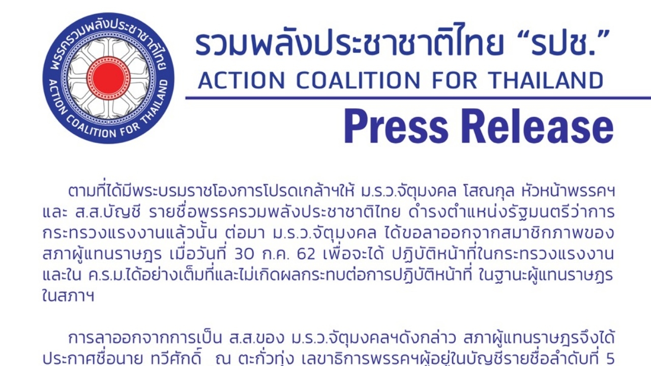วันที่ 6 ส.ค. นายเขตรัฐ เหล่าธรรมทัศน์ โฆษกพรรครวมพลังประชาชาติไทย (รปช.) กล่าวว่า ตามที่ได้มีพระบรมราชโองการโปรดเกล้าฯ ให้ ม.ร.ว.จัตุมงคล โสณกุล หัวหน้าพรรค และ ส.ส.บัญชีรายชื่อพรรครวมพลังประชาชาติไทย ดำรงตำแหน่งเป็น รมว.แรงงานแล้วนั้น ต่อมา ม.ร.ว.จัตุมงคล ได้ขอลาออกจากสมาชิกภาพของสภาผู้แทนราษฎร เมื่อวันที่ 30 ก.ค. 62 เพื่อจะได้ปฏิบัติหน้าที่ในกระทรวงแรงงานและในคณะรัฐมนตรีได้อย่างเต็มที่ และไม่เกิดผลกระทบต่อการปฏิบัติหน้าที่ในฐานะผู้แทนราษฎรในสภาฯ การลาออกจากการเป็น ส.ส.ของ ม.ร.ว.จัตุมงคล สภาผู้แทนราษฎร จึงได้ประกาศชื่อ นายทวีศักดิ์ ณ ตะกั่วทุ่ง เลขาธิการพรรค ซึ่งอยู่ในบัญชีรายชื่อลำดับที่ 5 ของพรรค ให้ขึ้นเป็น ส.ส.แทน เมื่อวันที่ 31 ก.ค. 62 แต่เนื่องจากนายทวีศักดิ์มีปัญหาด้านสุขภาพ ที่อาจมีผลกระทบต่อการปฏิบัติหน้าที่ ส.ส. จึงได้ยื่นขอลาออกจากสมาชิกภาพของสภาผู้แทนราษฎร เมื่อวันที่ 1 ส.ค. 62 โดยผู้ที่อยู่ในบัญชีรายชื่อของพรรครวมพลังประชาชาติไทยลำดับถัดไปที่สภาผู้แทนราษฎรจะประกาศให้เป็น ส.ส.บัญชีรายชื่อแทน คือ น.ส.จุฑาฑัตต เหล่าธรรมทัศน์.