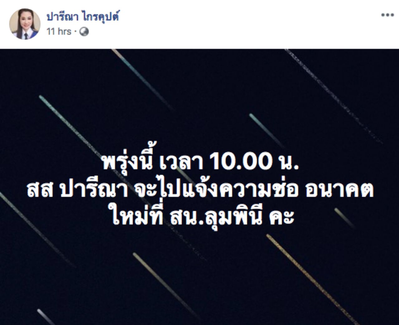 ทางด้าน น.ส.ปารีณา ได้โพสต์ข้อความว่า 10.00 น. วันนี้ จะไปแจ้งความ น.ส.พรรณิการ์ ที่ สน.ลุมพินี