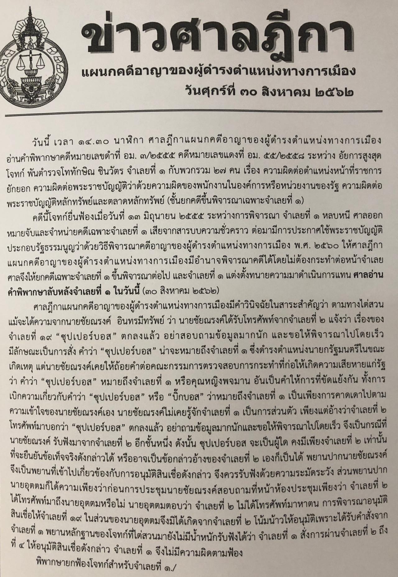 ทั้งนี้ ศาลได้อ่านคำพิพากษาลับหลังจำเลยที่ 1 ในวันนี้ ว่า ศาลฎีกาแผนกคดีอาญาของผู้ดำรงตำแหน่งทางการเมือง มีคำวินิจฉัยในสาระสำคัญกรณีคำว่า “ซุปเปอร์บอส” หรือ “บิ๊กบอส” ที่ นายณรงค์ชัย อินทรมีทรัพย์ แจ้งว่ามีลักษณะที่น่าจะหมายถึง นายทักษิณ ซึ่งดำรงตำแหน่งนายกรัฐมนตรีในขณะเกิดเหตุ เป็นเพียงการคาดเดาไปตามความเข้าใจของนายณรงค์ชัย ซึ่งนายณรงค์ชัยไม่รู้จักนายทักษิณเป็นการส่วนตัว เพียงแต่อ้างว่า นายวิโรจน์ นวลแข จำเลยที่ 2 โทรศัพท์มาบอกว่า “ซุปเปอร์บอส ตกลงแล้ว อย่าถามข้อมูลมาก และขอให้พิจารณาไปโดยเร็ว”