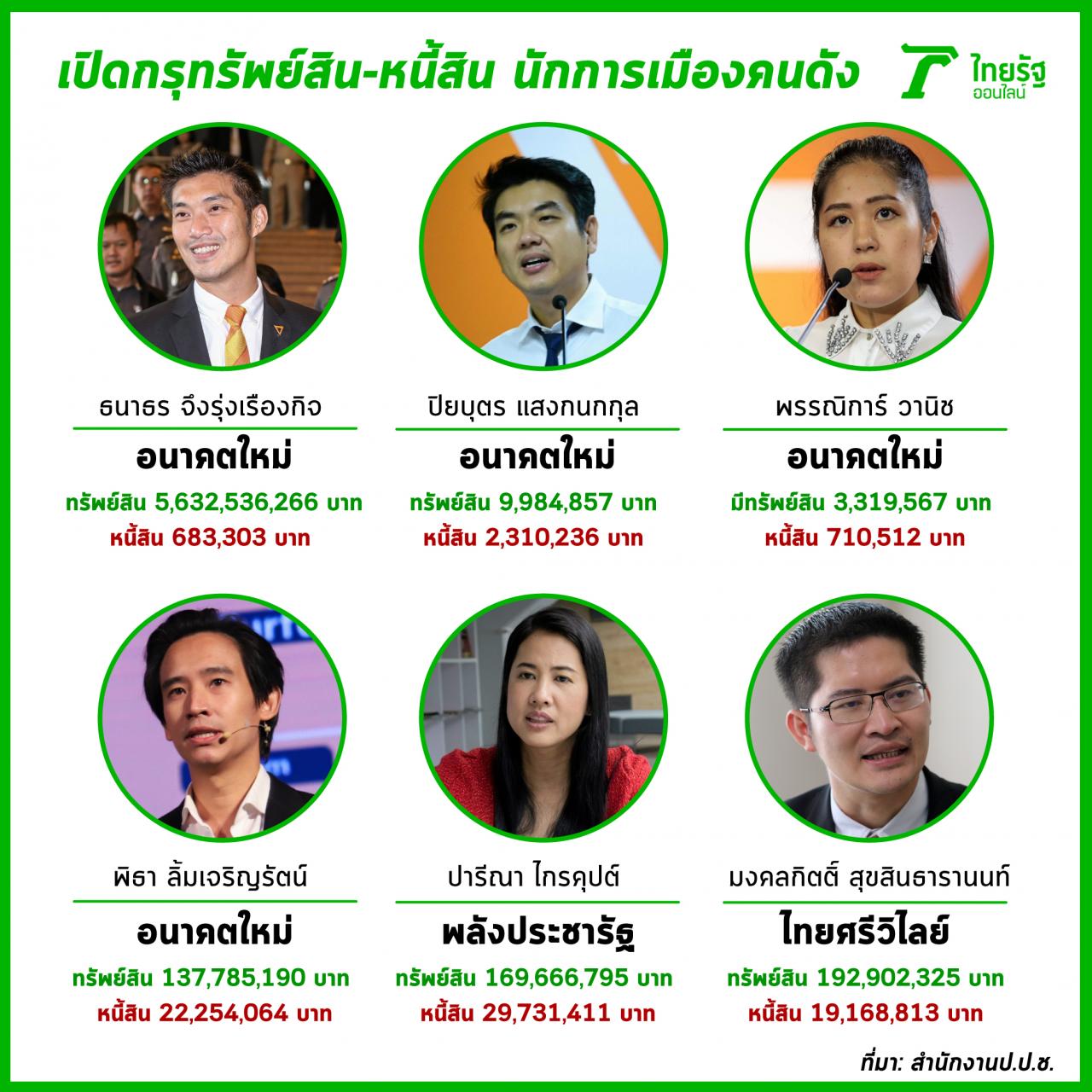 วันที่ 20 ก.ย. คณะกรรมการป้องกันและปราบปรามการทุจริตแห่งชาติ หรือ ป.ป.ช. เปิดบัญชีทรัพย์สินและหนี้สิน ส.ส. รอบที่ 2 กรณีเข้ารับตำแหน่ง เมื่อวันที่ 25 พฤษภาคม จำนวน 80 คน โดย ส.ส.กลุ่มนี้ คือ ส.ส.ที่ขอเลื่อนการยื่นบัญชีทรัพย์สินต่อ ป.ป.ช.ออกไปจากกำหนดเดิม ซึ่งมีบัญชีที่น่าสนใจ ดังนี้ นายธนาธร จึงรุ่งเรืองกิจ ส.ส.และหัวหน้าพรรคอนาคตใหม่ มีทรัพย์สิน 5,623 ล้านบาท ส่วนใหญ่เป็น เงินลงทุน 3,012 ล้านบาท ของคู่สมรส 192 ล้านบาท เงินฝาก 1,527 ล้านบาท คู่สมรส 237 ล้านบาท สิทธิและสัมปทาน 285 ล้านบาท คู่สมรส 11 ล้านบาท มีหนี้สินรวมคู่สมรส 683 ล้านบาท ทั้งนี้ นายธนาธร ยังได้ระบุทรัพย์สินในส่วนเงินกู้ยืม จำนวน 202 ล้านบาท โดยในจำนวนนี้ กู้ยืมโดยพรรคอนาคตใหม่ 191 ล้านบาท