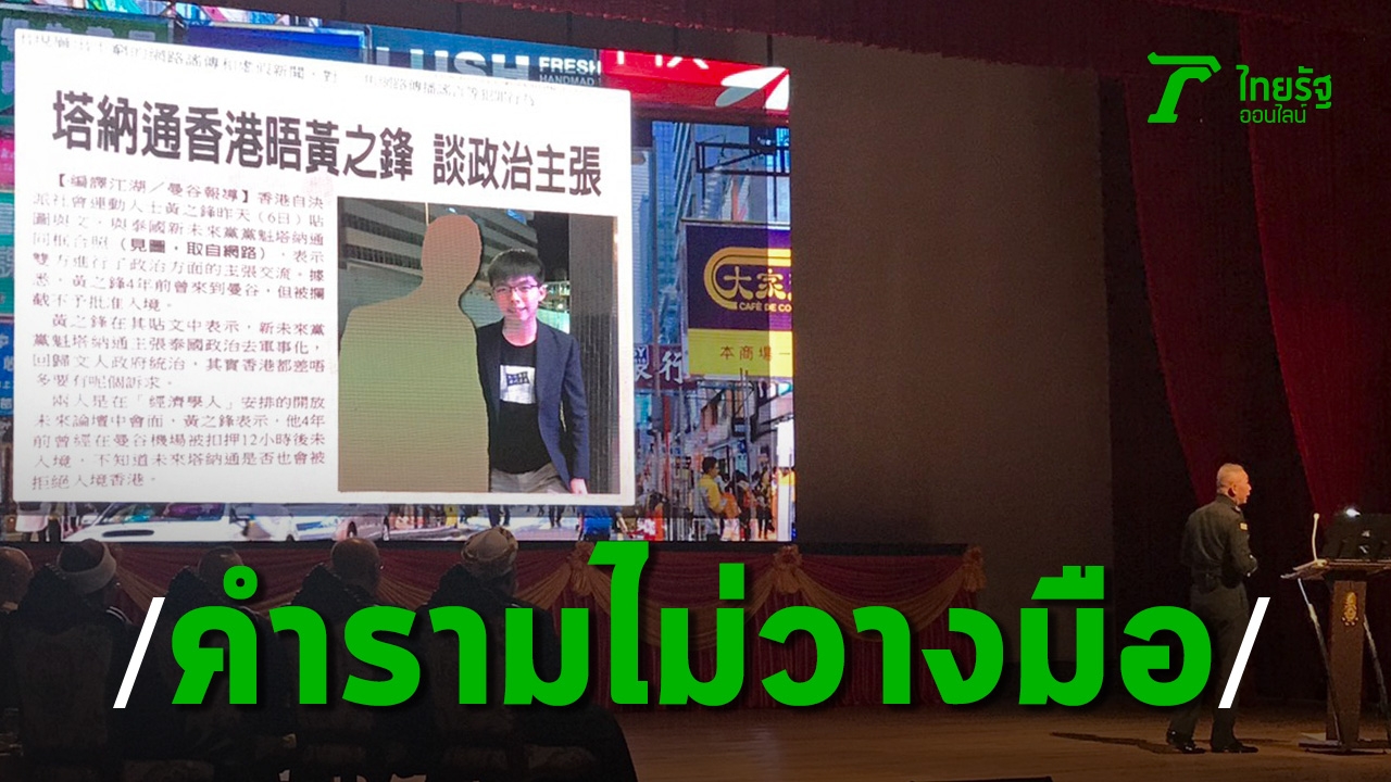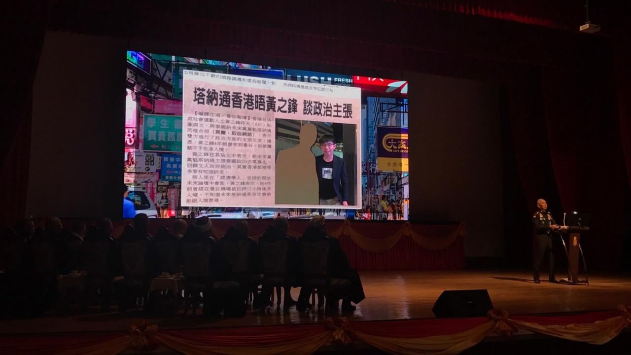 พล.อ.อภิรัชต์ ยังได้บรรยายถึงสถานการณ์ในโลกปัจจุบัน ที่มีความขัดแย้งอยู่ทั่วทุกมุมโลก ซึ่งสาเหตุส่วนหนึ่งมาจากการปลุกปั่นของคนในชาติ โดยในช่วงนี้ผู้บัญชาการทหารบก ได้เปิดภาพเกี่ยวกับเหตุการณ์ต่างๆ ที่เกิดขึ้นในต่างประเทศ ที่หนึ่งในนั้นมีภาพเหตุความขัดแย้งทางการเมืองของฮ่องกง และภาพของนายโจชัว หว่อง นักเคลื่อนไหวชาวฮ่องกง และระบุว่า ก่อนหน้านี้ฮ่องกงเป็นประเทศที่น่าท่องเที่ยว แต่ตอนนี้ไม่มีใครอยากไปจะมีก็แค่นักการเมืองบางคนที่ไป พร้อมตั้งคำถามว่า การเดินทางมาพบพูดคุยกันนั้นไม่รู้ว่า มีการสมคบคิดวางแผนอะไรอยู่หรือไม่