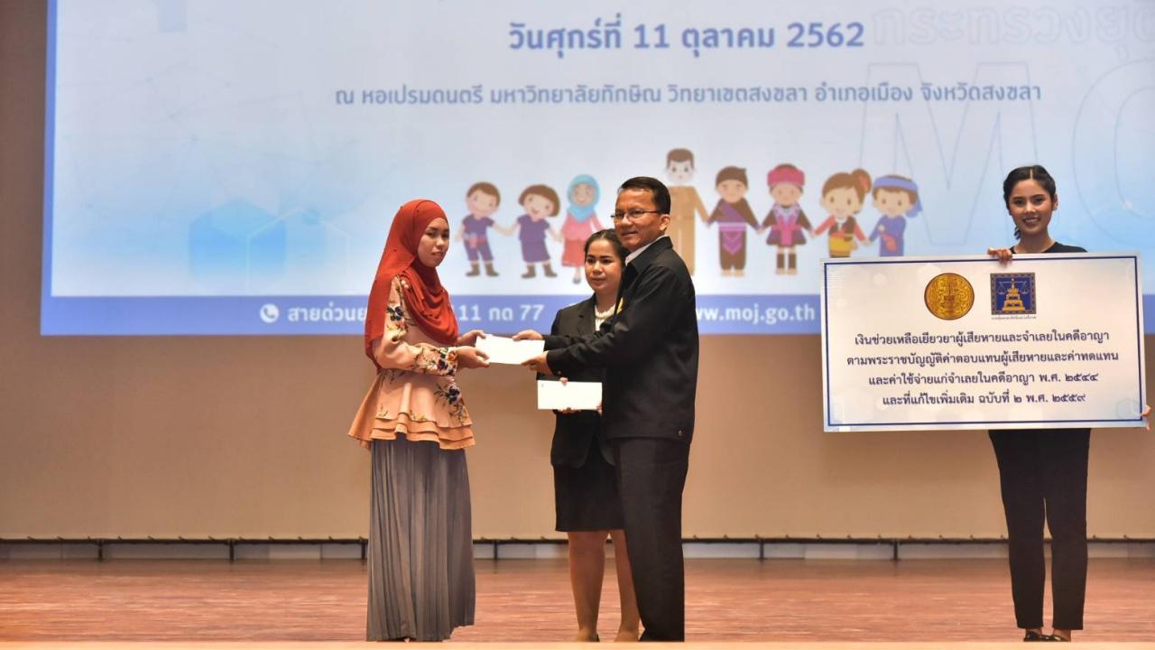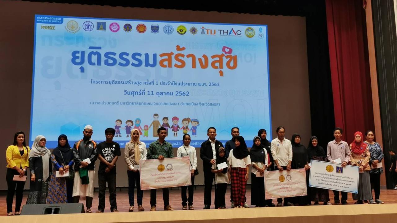 เมื่อวันที่ 11 ต.ค. ที่หอเปรมดนตรี มหาวิทยาลัยทักษิณ อ.เมือง จ.สงขลา นายสมศักดิ์ เทพสุทิน รมว.ยุติธรรม เป็นประธานในพิธีเปิดโครงการยุติธรรมสร้างสุข ครั้งที่ 1 ประจำปีงบประมาณ 2562 โดยมีนายสามารถ เจนชัยจิตรวนิช ผู้ช่วยรมว.ยุติธรรม นายวิศิษฏ์ วิศิษฏ์สรอรรถ ปลัดกระทรวงยุติธรรม นายจารุวัฒน์ เกลี้ยงเกลา ผู้ว่าราชการจังหวัดสงขลา นายวิชัย ชำนิ อธิการบดีมหาวิทยาลัยทักษิณ ข้าราชการ นิสิต นักศึกษา และประชาชนทั่วไปเข้าร่วมงาน ทั้งนี้ นายสมศักดิ์ ได้มอบเงินเยียวยาผู้เสียหายและจำเลยในคดีอาญาพื้นที่จ.สงขลาและนราธิวาส 16 ราย รวมเป็นเงิน 1,475,746 บาท และมอบเงินช่วยเหลือกองทุนยุติธรรมในการขอปล่อยตัวชั่วคราวผู้ต้องหา หรือจำเลย จำนวน 2 ราย รวมเป็นเงิน 1,000,000 บาท