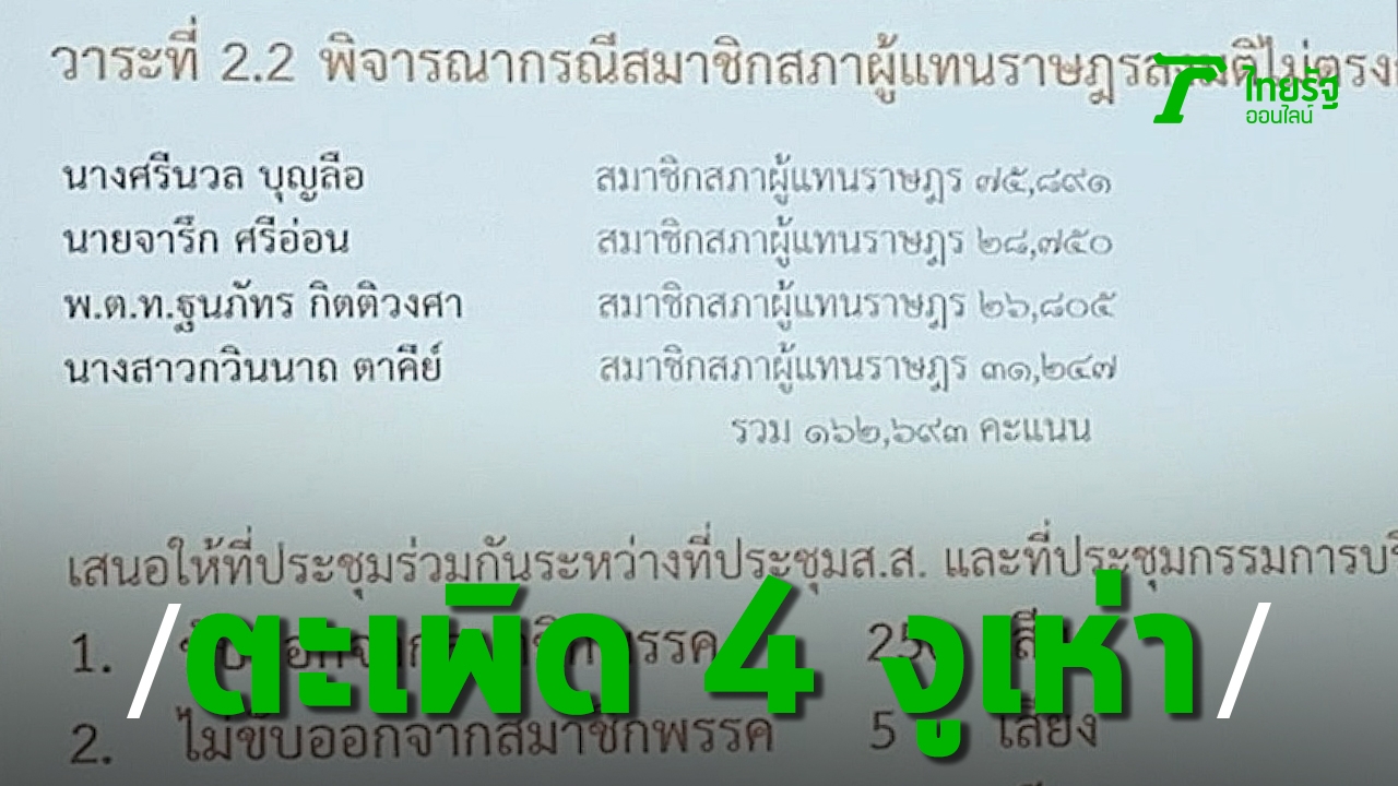 เมื่อวันที่ 16 ธ.ค.62 นายณัฐชา บุญไชยอินสวัสดิ์ รองโฆษกพรรคอนาคตใหม่ (อนค.) กล่าวว่า ที่ประชุมใหญ่วิสามัญสมาชิกพรรคอนาคตใหม่ วันนี้ มีวาระการพิจารณากรณี ส.ส.ลงมติไม่ตรงกับมติพรรค ซึ่งมี ส.ส.4 คน ได้แก่ นางศรีนวล บุญลือ ส.ส.เชียงใหม่ เขต 8, นายจารึก ศรีอ่อน ส.ส.จันทบุรี เขต 2, พ.ต.ท.ฐนภัทร กิตติวงศา ส.ส.จันทบุรี เขต 1 และ น.ส.กวินนาถ ตาคีย์ ส.ส.ชลบุรี เขต 7 โดยที่ประชุมฯ มีมติ 250 เสียงให้ขับออกจากการเป็นสมาชิกพรรคอนาคตใหม่ และมีมติ 5 เสียง ไม่ขับออกจากสมาชิกพรรค รวมถึงมีบัตรเสีย 6 ใบ โดยจะเสนอเข้าสู่ที่ประชุม ส.ส. และที่ประชุมกรรมการบริหารพรรคอนาคตใหม่ ในวันที่ 17 ธ.ค.62 โดยจะทราบผลทันทีหลังเสร็จสิ้นการประชุม