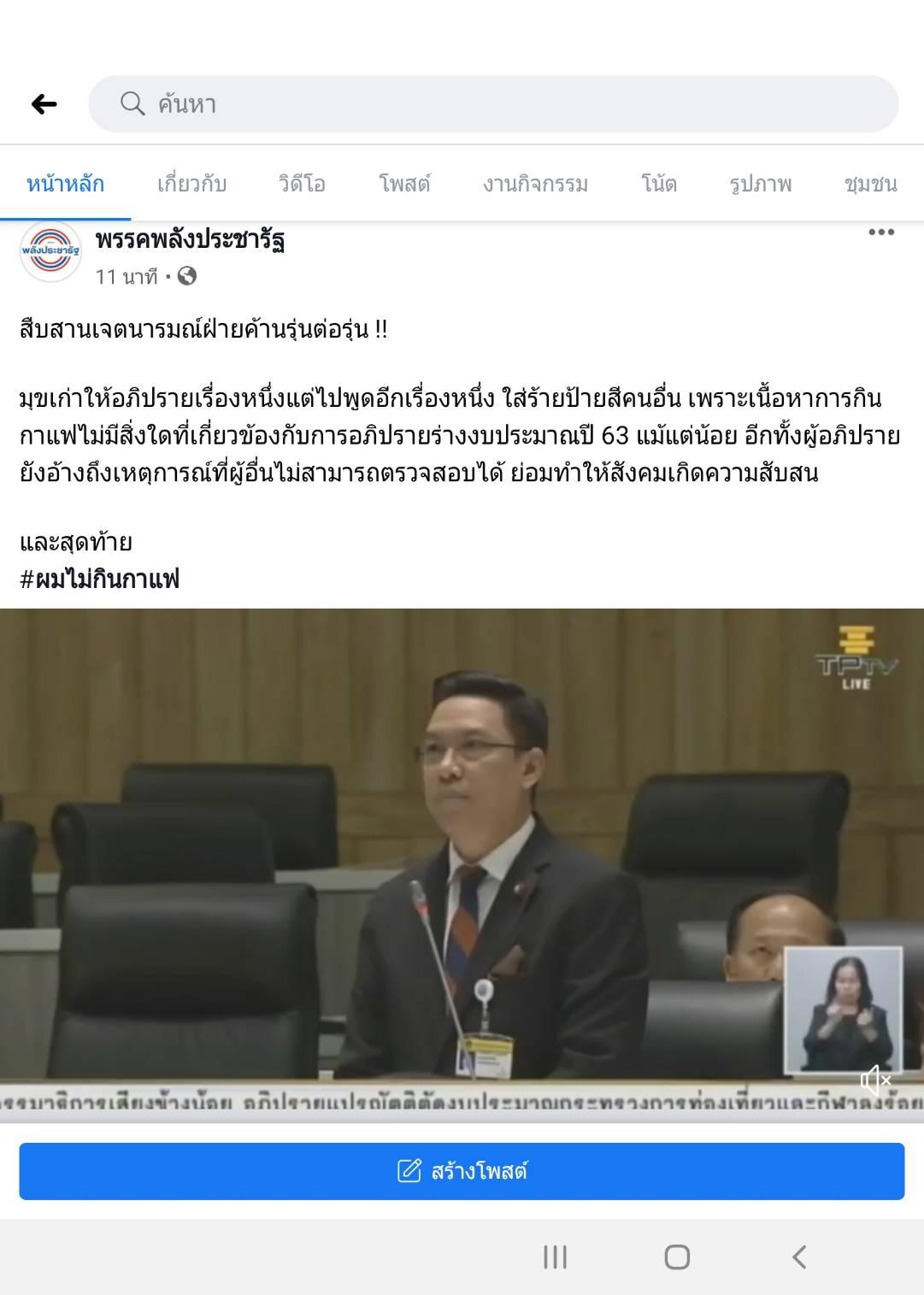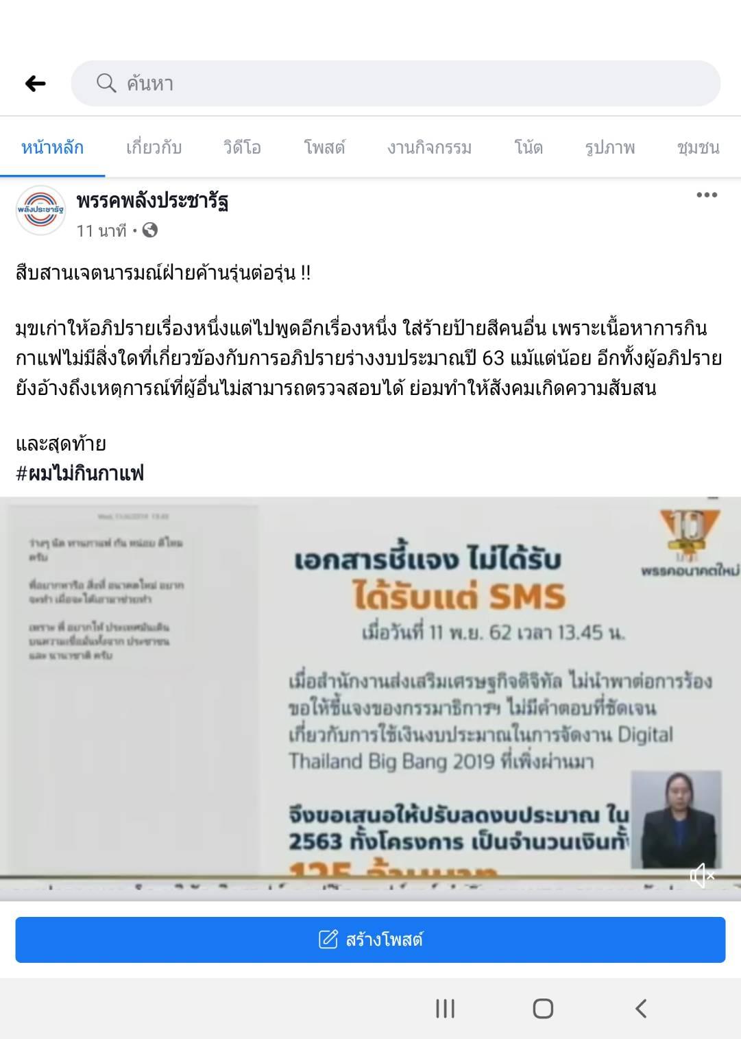 ล่าสุด เฟซบุ๊กแฟนเพจพรรคพลังประชารัฐ โพสต์คลิปวิดีโอ พร้อมข้อความ สืบสานเจตนารมณ์ฝ่ายค้านรุ่นต่อรุ่น มุกเก่า ให้อภิปรายเรื่องหนึ่งแต่ไปพูดอีกเรื่องหนึ่ง ใส่ร้ายป้ายสีคนอื่น เพราะเนื้อหาการกินกาแฟ ไม่มีสิ่งใดที่เกี่ยวกับการอภิปรายร่างงบประมาณปี 63 แม้แต่น้อย อีกทั้งผู้อภิปรายยังอ้างถึงเหตุการณ์ที่ผู้อื่นไม่สามารถตรวจสอบได้ ย่อมทำให้สังคมเกิดความสับสน และสุดท้าย #ผมไม่กินกาแฟ