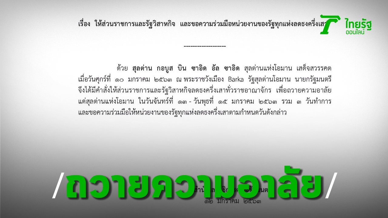 นายกฯ มีคำสั่งให้ส่วนราชการ-รัฐวิสาหกิจ ลดธงครึ่งเสา เพื่อถวายความอาลัยแด่ "สุลต่านแห่งโอมาน" เสด็จสวรรคต 3 วัน ตั้งแต่ 13-15 ม.ค.63