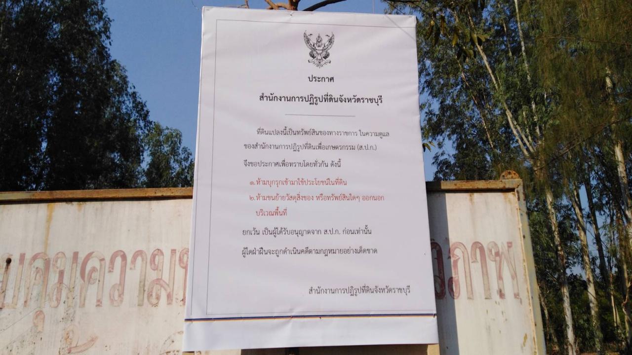 จนเมื่อวันที่ 11 ธ.ค.62 ผู้สื่อข่าวไทยรัฐพบว่า บริเวณหน้าฟาร์มไก่ เขาสนฟาร์ม ทางสำนักงานการปฏิรูปที่ดินจังหวัดราชบุรี ได้นำป้ายประกาศไปติดบริเวณด้านหน้าประตูมีข้อความว่า “ประกาศสำนักงานการปฏิรูปที่ดินจังหวัดราชบุรี ที่ดินแปลงนี้เป็นทรัพย์สินของทางราชการ ในความดูแลของสำนักงานการปฏิรูปที่ดินเพื่อเกษตรกรรม (ส.ป.ก.) จึงขอประกาศเพื่อทราบโดยทั่วกันดังนี้ 1.ห้ามบุกรุกเข้ามาใช้ประโยชน์ในที่ดิน 2.ห้ามขนย้ายวัสดุสิ่งของ หรือทรัพย์สินใดๆ ออกนอกบริเวณพื้นที่ ยกเว้นเป็นผู้ได้รับอนุญาตจาก ส.ป.ก.ก่อนเท่านั้นผู้ใดฝ่าฝืนจะถูกดำเนินคดีตามกฎหมายอย่างเด็ดขาด สำนักงานการปฏิรูปที่ดินจังหวัดราชบุรี”