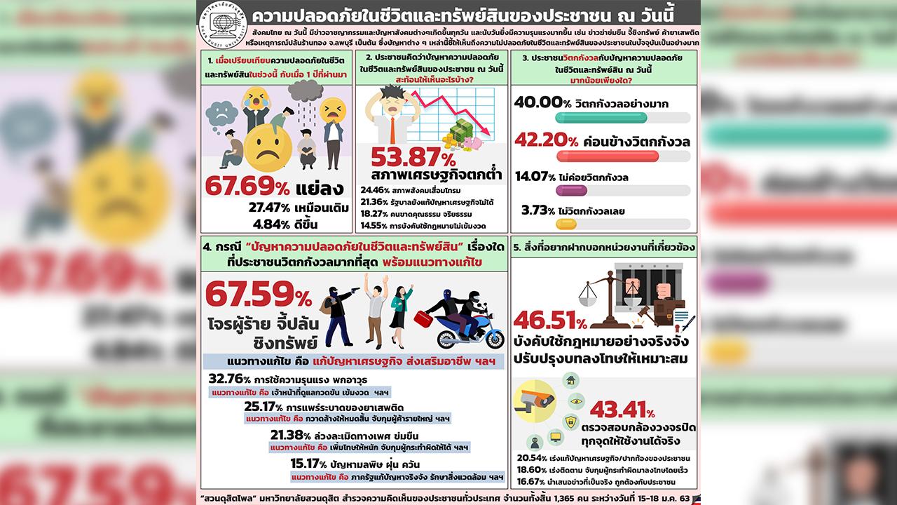 สวนดุสิตโพล เผย คนไทยส่วนใหญ่ กว่า 67% ชี้ ความปลอดภัยในชีวิตทรัพย์สินแย่ลง จากผลพวงเศรษฐกิจตกต่ำ วิตก โจรผู้ร้าย จี้ ปล้น ชิงทรัพย์มากสุด