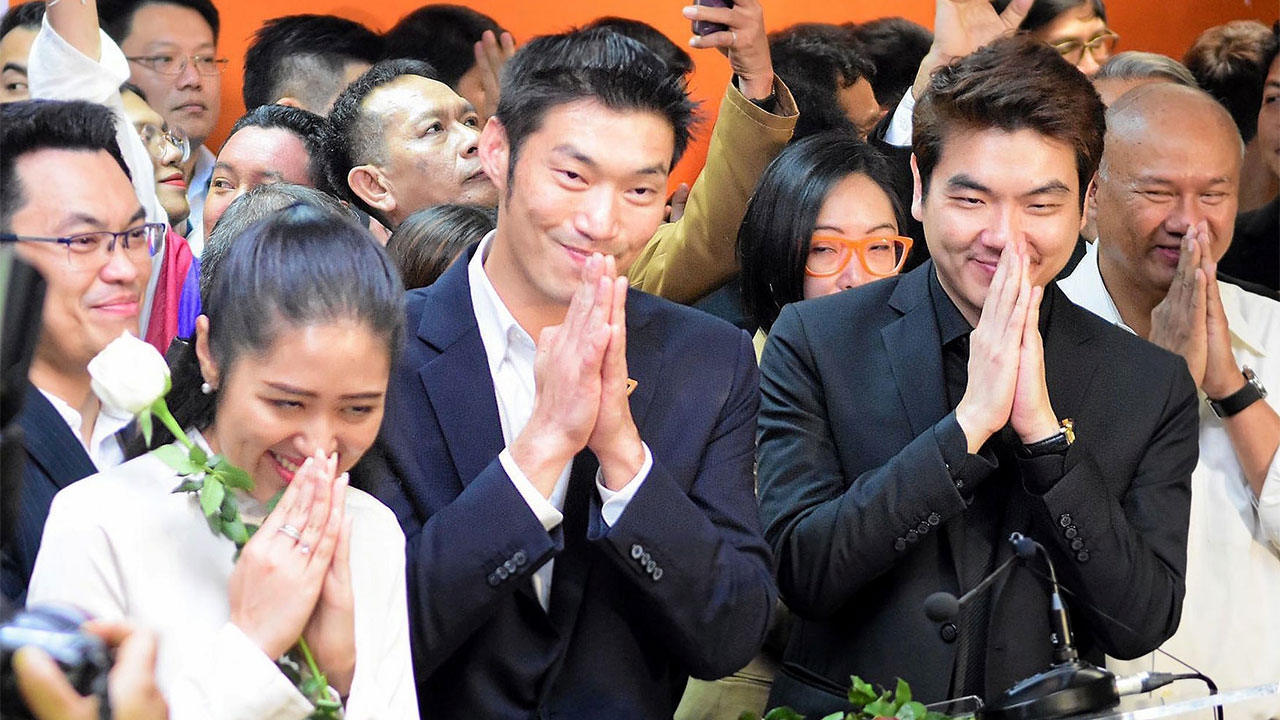 นายธนาธร จึงรุ่งเรืองกิจ หัวหน้าพรรคอนาคตใหม่ พร้อมด้วยแกนนำคนสำคัญของพรรค ยกมือไหว้ขอบคุณกลุ่มผู้สนับสนุน หลังรับทราบผลคำวินิจฉัยของศาลรัฐธรรมนูญ ให้ยกคำร้องคดีถูกกล่าวหา ว่าคิดล้มล้างการปกครองฯ ตามรัฐธรรมนูญมาตรา 49 พร้อมประกาศเดินหน้าลุยงานทั้งใน-นอกสภาฯ และสู้คดีการกู้เงินของพรรคต่อ.