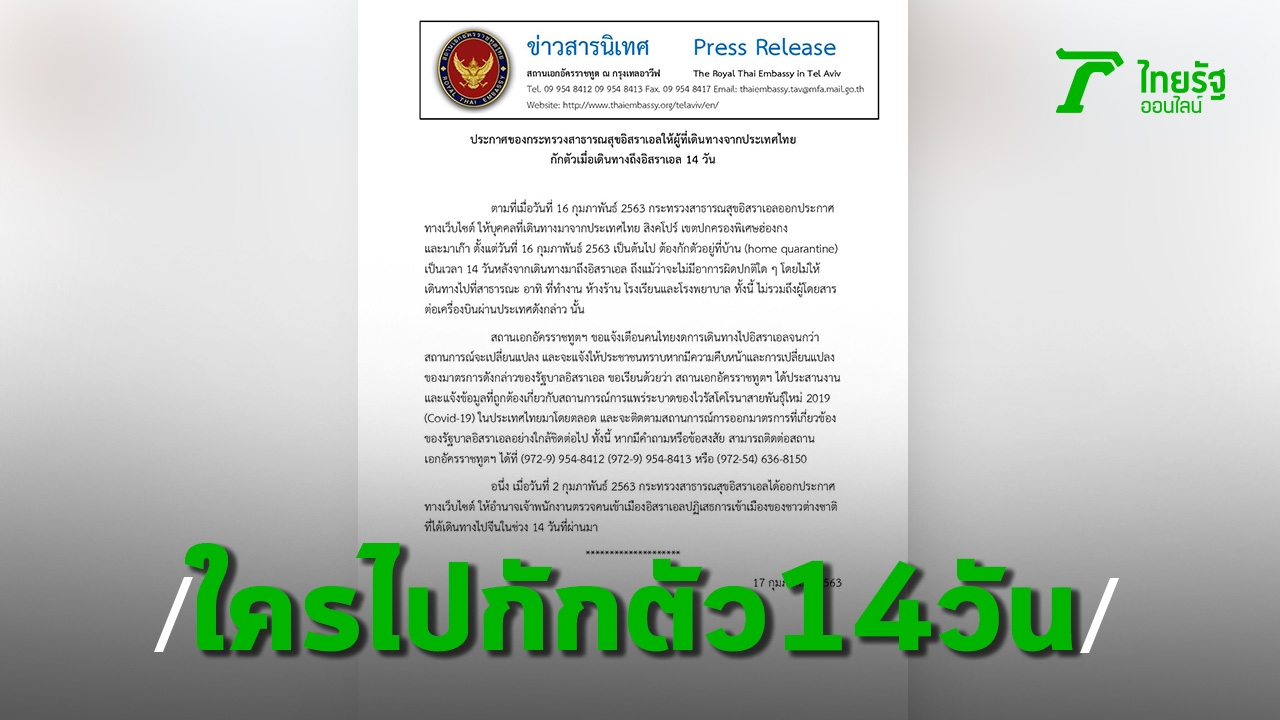 สถานเอกอัครราชทูต ณ กรุงเทลอาวีฟ ประกาศกระทรวง สธ.อิสราเอล ให้ผู้ที่เดินทางจาก "ไทย-สิงคโปร์- ฮ่องกงและมาเก๊า" ต้องถูกกักตัว 14 วันทันที เมื่อเดินทางถึง ขอคนไทยงดเดินทางไปช่วงนี้