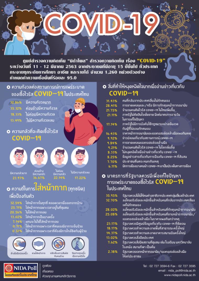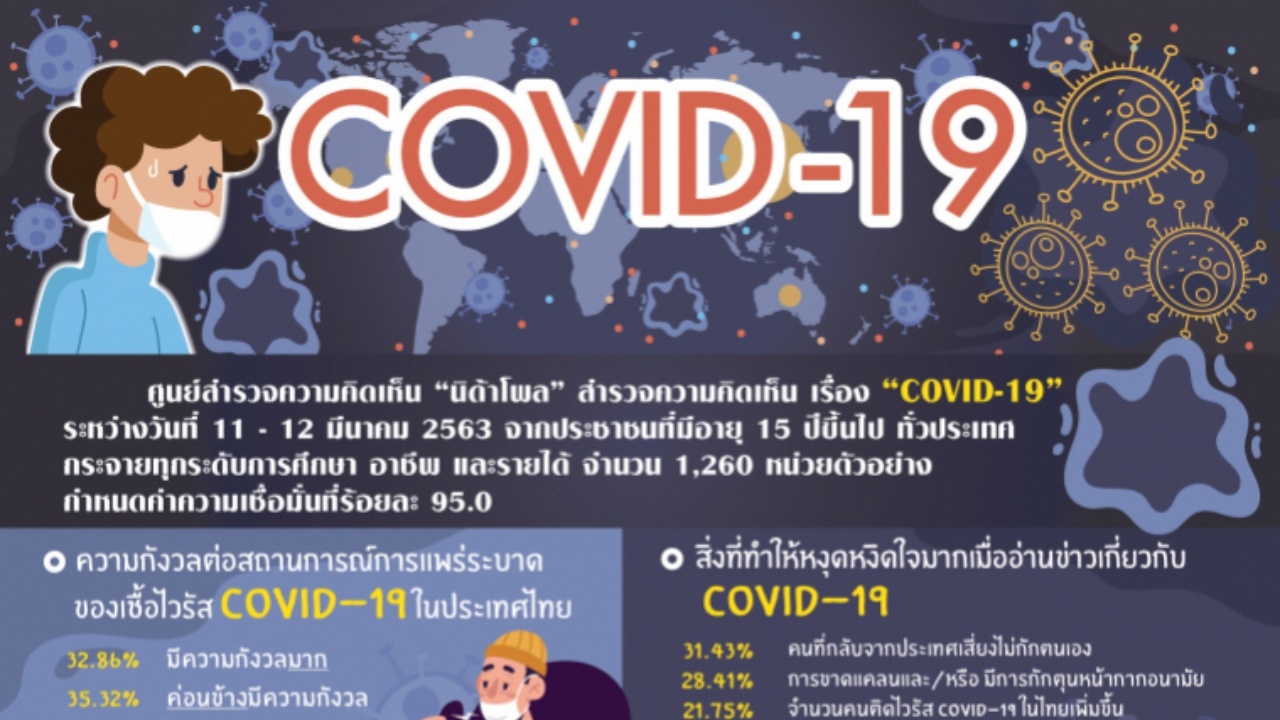 ศูนย์สำรวจความคิดเห็น “นิด้าโพล” สถาบันบัณฑิตพัฒนบริหารศาสตร์ (นิด้า) เปิดเผยผลสำรวจของประชาชน เรื่อง “COVID-19” ทำการสำรวจระหว่างวันที่ 11 – 12 มีนาคม 2563 จากประชาชนที่มีอายุ 15 ปีขึ้นไป กระจายทุกภูมิภาค ระดับการศึกษา และอาชีพทั่วประเทศ รวมทั้งสิ้น จำนวน 1,260 หน่วยตัวอย่าง เกี่ยวกับสถานการณ์การแพร่ระบาดของเชื้อไวรัส COVID-19 ในประเทศไทย การสำรวจอาศัยการสุ่มตัวอย่างโดยใช้ความน่าจะเป็นจากบัญชีรายชื่อฐานข้อมูลตัวอย่างหลัก (Master Sample) ของ “นิด้าโพล” สุ่มตัวอย่างด้วยวิธีแบบง่าย (Simple Random Sampling) เก็บข้อมูลด้วยวิธีการสัมภาษณ์ทางโทรศัพท์โดยกำหนดค่าความเชื่อมั่นที่ร้อยละ 95.0