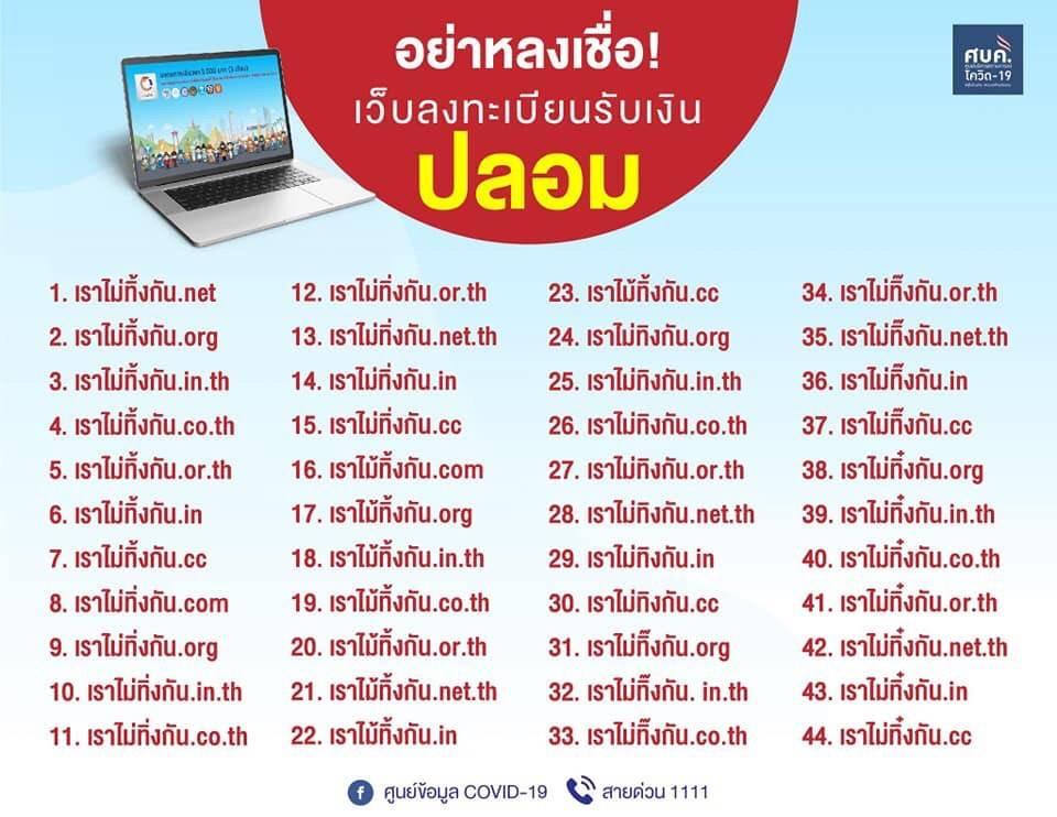 ขณะนี้ มีผู้แสวงหาประโยชน์โดยมิชอบ หรือกลุ่มมิจฉาชีพที่ฉวยโอกาสในช่วงวิกฤติเอารัดเอาเปรียบผู้ได้รับความเดือดร้อนจากไวรัสโควิด-19 ผ่านวิธีการต่างๆ มากมาย โดยเฉพาะการเปิดเว็ปไซต์ปลอม ซึ่งมีมากกว่า 44 เว็บไซต์ และพยายามแสวงหาผลประโยชน์ผ่านโซเชียลมีเดียจากมาตรการนี้ โดยอ้างว่าจะรับลงทะเบียนให้เพื่อแลกเปลี่ยนกับความสะดวก รวมทั้งขอค่าตอบแทนบางส่วนจากเงินที่ได้รับจากมาตรการช่วยเหลือนี้ ดังนั้น พี่น้องประชาชนอย่าหลงเชื่อผู้ที่หาผลประโยชน์โดยไม่ถูกต้องเหล่านั้น เพื่อป้องกันความเสี่ยงจากการนำข้อมูลส่วนตัวของท่านไปใช้ประโยชน์อื่นใดในทางที่ไม่ถูกต้อง และส่งผลให้ท่านได้รับความเสียหายทางการเงินตามมา