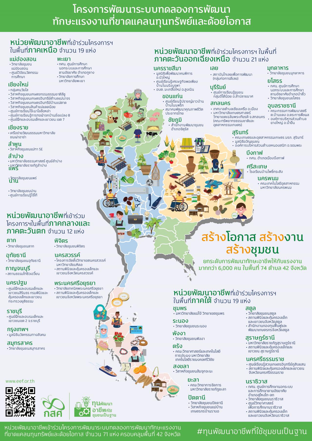 ผู้อำนวยการสำนักส่งเสริมการมีส่วนร่วมนวัตกรรมและทุนการศึกษา กสศ. กล่าวว่า จากการดำเนินงานได้พัฒนาเป็นหลักสูตรระยะสั้นที่ช่วยยกระดับทักษะการประกอบอาชีพแรงงานที่ขาดแคลนทุนทรัพย์และด้อยโอกาส จำนวน 74 หลักสูตร อาทิ เกษตรผสมผสานระบบอินทรีย์ ผู้ประกอบการผ้าไหมขนาดย่อม เครื่องปั้นดินเผา ระบบประกอบการสังคมออนไลน์ นักขายมือทอง (young sales man) นวดไทยเพื่อสุขภาพ การทำคุกกี้ครบวงจร การทำเครื่องแกงพื้นบ้าน โดยระบบต้นแบบของ กสศ.สามารถช่วยเหลือกลุ่มเป้าหมายซึ่งเป็นแรงงานนอกระบบ ผู้สูงอายุ คนพิการ ผู้ว่างงาน ผู้ถือบัตรสวัสดิการคนจน เด็กและเยาวชนในสถานพินิจ ได้จำนวน 6,055 คน ทั้งนี้ สามารถดูรายละเอียดเพิ่มเติมได้ที่แผนที่ทุนพัฒนาอาชีพที่ใช้ชุมชนเป็นฐานของ กสศ. https://csr.eef.or.th/commubased-map/ ติดต่อข้อมูลเพิ่มเติมที่ 0-2079-5475