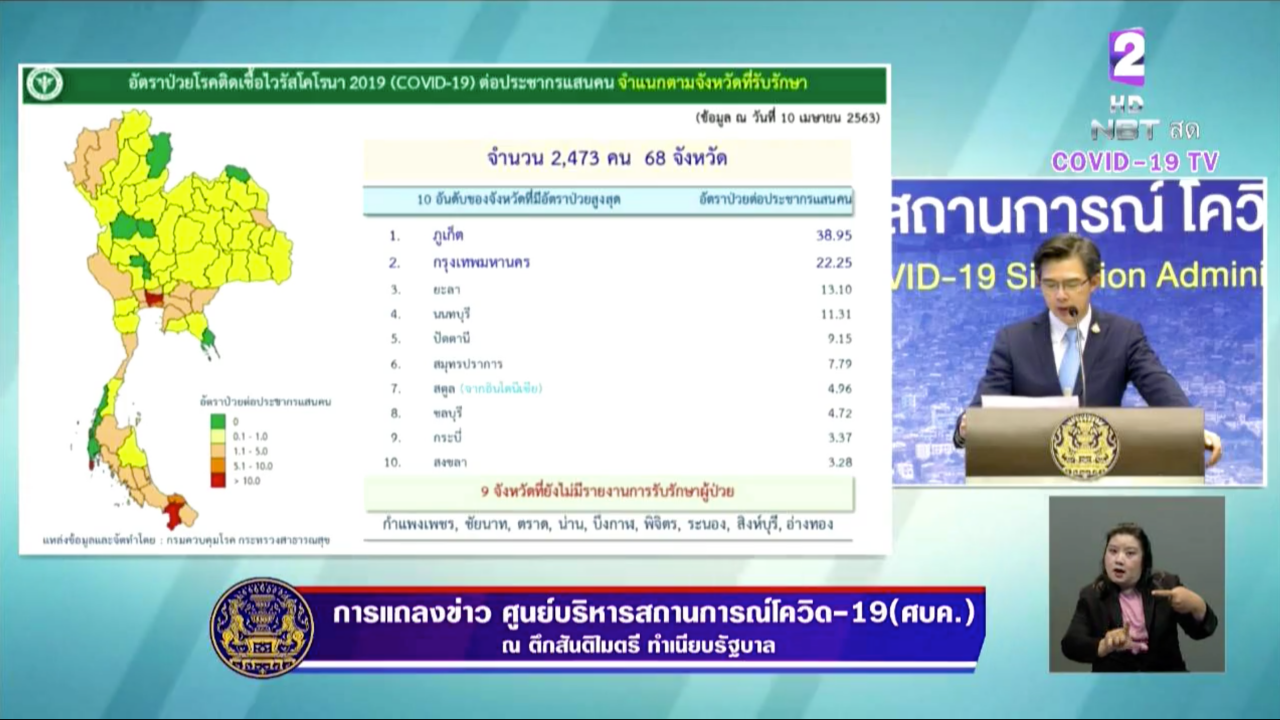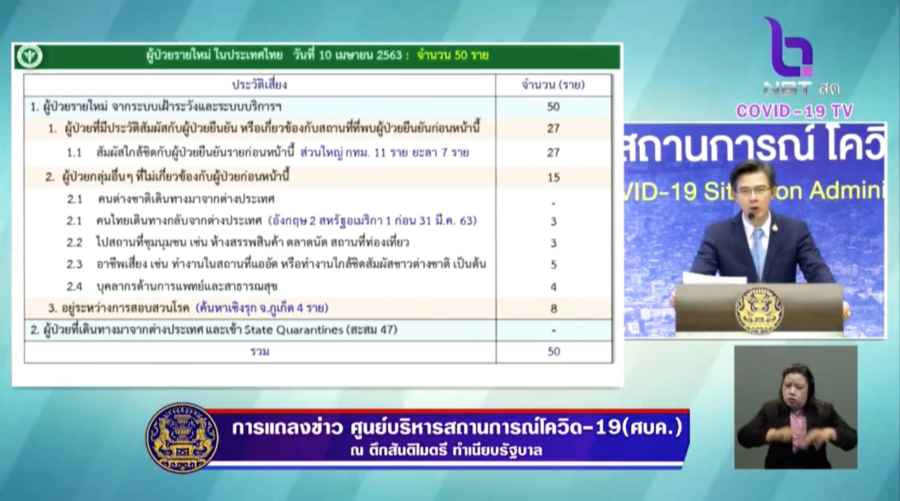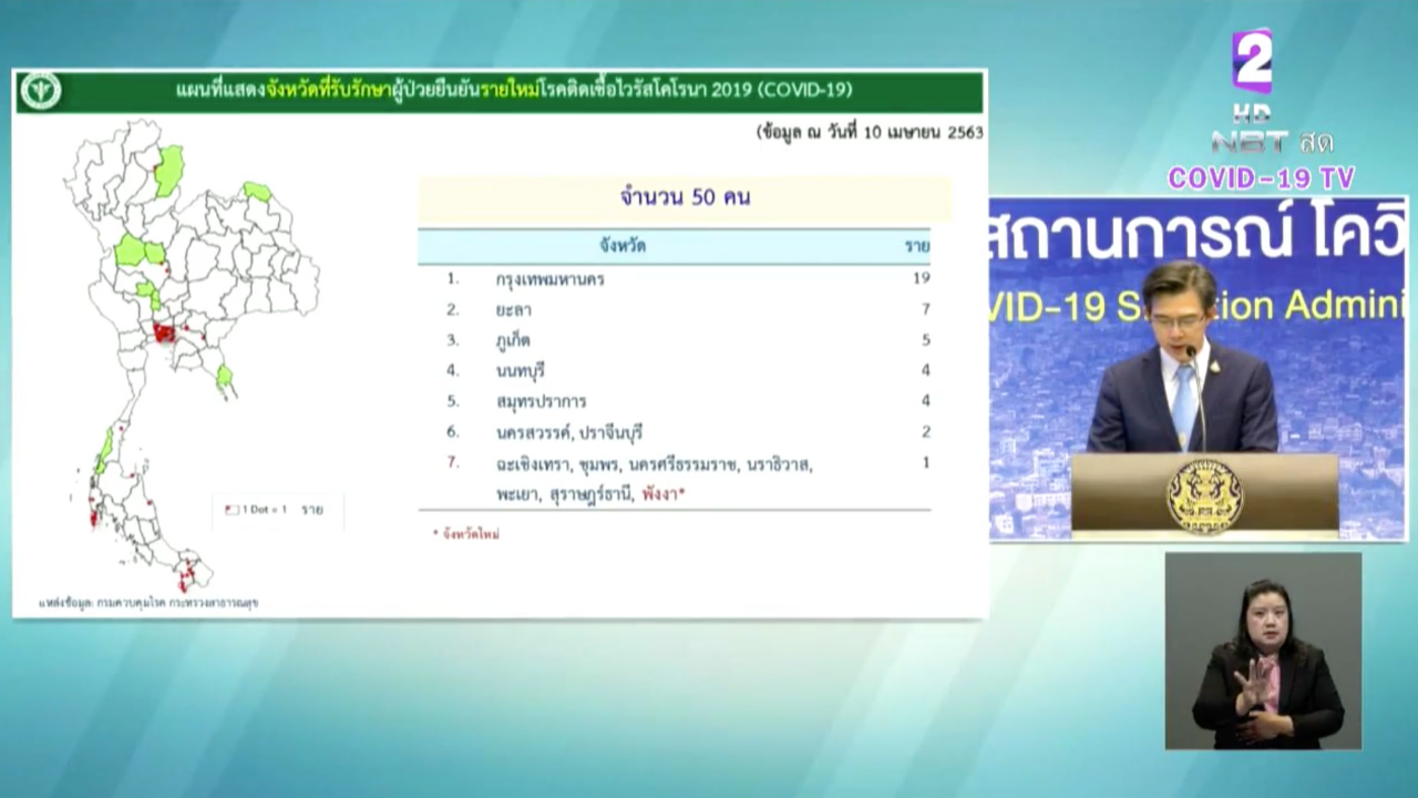 วันที่ 10 เมษายน 2563 นายแพทย์ทวีศิลป์ วิษณุโยธิน โฆษกศูนย์บริหารสถานการณ์การแพร่ระบาดของโรคติดเชื้อไวรัสโคโรนา 2019 (โควิด-19) หรือ ศบค. แถลงสถานการณ์โควิด-19 ประจำวัน ว่า วันนี้มีผู้ป่วยยืนยันรายใหม่ 50 ราย รักษาหายแล้ว 1,013 ราย ผู้เสียชีวิตเพิ่ม 1 ศพ รวมผู้เสียชีวิต 33 ศพ ยอดผู้ป่วยยืนยันสะสม 2,473 ราย และผู้ป่วยใหม่ยังคงแบ่งเป็น 3 กลุ่มดังนี้
