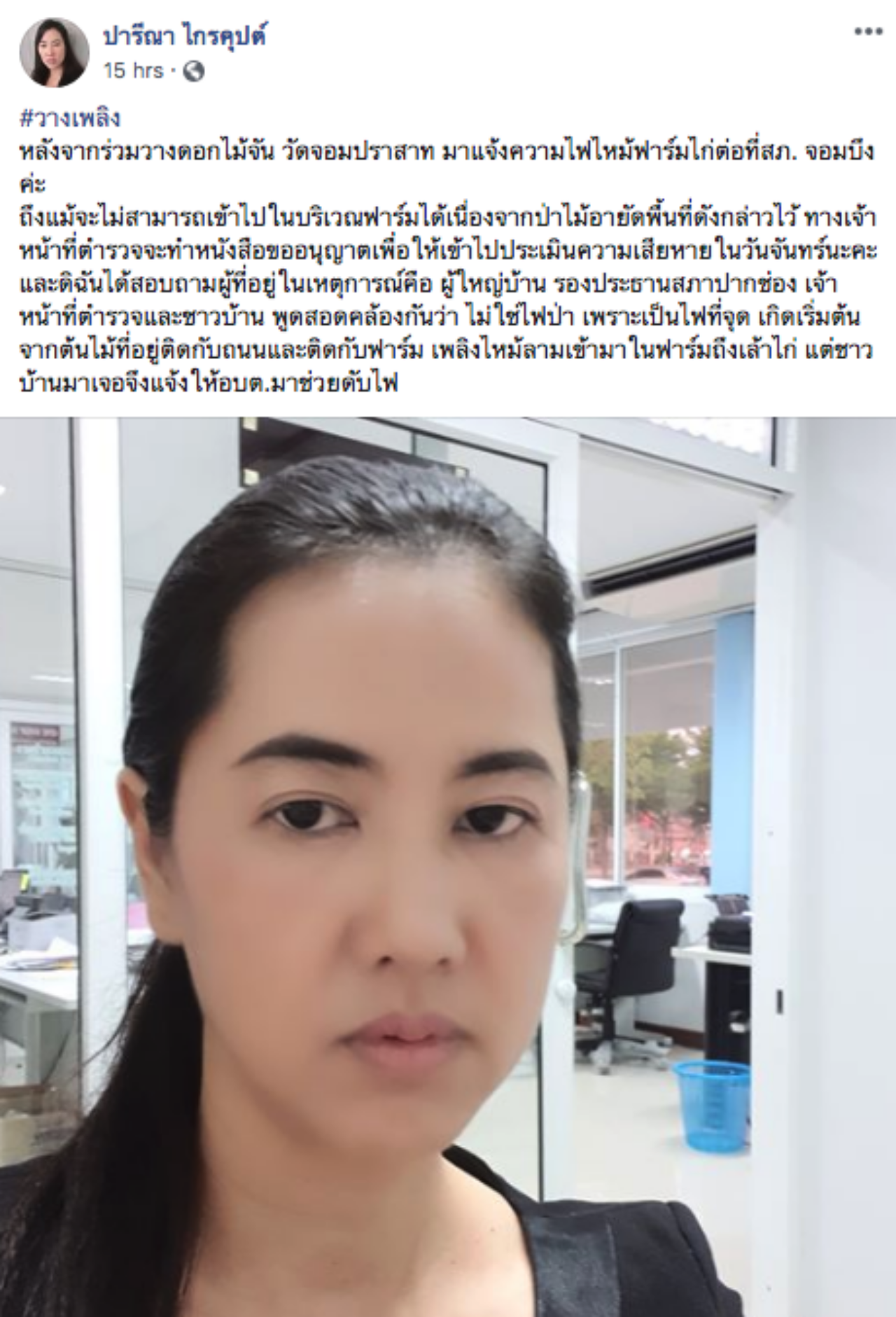“ดิฉันได้สอบถามผู้ที่อยู่ในเหตุการณ์คือ ผู้ใหญ่บ้าน รองประธานสภาฯ ปากช่อง เจ้าหน้าที่ตำรวจ และชาวบ้าน พูดสอดคล้องกันว่า ไม่ใช่ไฟป่า เพราะเป็นไฟที่จุดเกิดเริ่มต้นจากต้นไม้ที่อยู่ติดกับถนนและติดกับฟาร์ม เพลิงไหม้ลามเข้ามาในฟาร์มถึงเล้าไก่ แต่ชาวบ้านมาเจอจึงแจ้งให้ อบต.มาช่วยดับไฟ”.