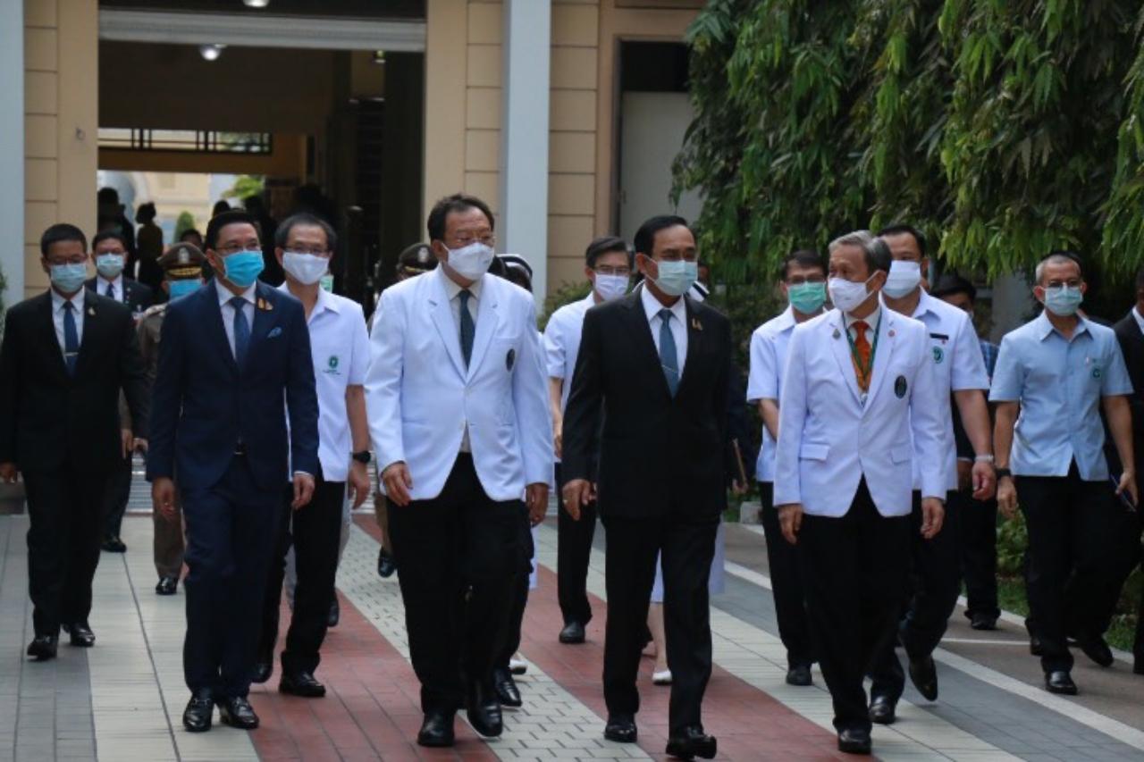 โอกาสนี้ นายกรัฐมนตรี พูดคุยสอบถามแพทย์ พยาบาล และเจ้าหน้าที่ ในการปฏิบัติงานและให้กำลังใจทุกคนว่า ชื่นชมหมอทุกคน ตนเองคุ้นเคยกับที่นี่เพราะพ่อแม่ก็รักษาที่นี่ รวมถึงได้เคยมาอารักขาเมื่อครั้งที่ พระบาทสมเด็จพระเจ้าอยู่หัว รัชกาลที่ 9 เสด็จฯ มาประทับที่นี่และในหลายๆ โอกาส ชื่นชมมาโดยตลอดและเป็นที่เชื่อมั่นศรัทธาของประชาชน ซึ่งสิ่งที่เราทำวันนี้ถือว่าทำถวาย พระบาทสมเด็จพระเจ้าอยู่หัว รัชกาลที่ 9 และพระบาทสมเด็จพระเจ้าอยู่หัว รัชกาลที่ 10 พระองค์ท่านทรงฝากกำลังใจมาถึงพวกเราทุกคน ชื่นชมในการทำงานที่มีความก้าวหน้าในทางที่ดีขึ้น ตนเองถวายรายงานพระองค์ท่านทุกวัน โดยส่งข้อสรุปทั้งจากกระทรวงสาธารณสุข จากการแถลงศูนย์โควิด-19 ขึ้นไปทุกวัน พระองค์ท่านรับสั่งว่าหากมีสิ่งหนึ่งสิ่งใดที่พระองค์ทรงช่วยได้ขอให้บอกมา