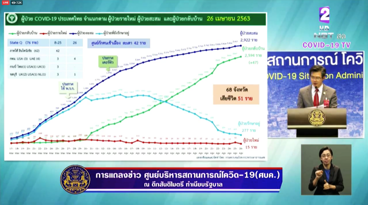 เมื่อเวลา 11.30 น. วันที่ 26 เม.ย. 2563 นายแพทย์ทวีศิลป์ วิษณุโยธิน โฆษกศูนย์บริหารสถานการณ์การแพร่ระบาดของโรคติดเชื้อไวรัสโคโรนา 2019 (โควิด-19) หรือ ศบค. แถลงสถานการณ์การระบาดของไวรัสโควิด-19 ในประเทศไทย โดยวันนี้มีผู้ป่วยยืนยันเพิ่ม 15 ราย หายเพิ่ม 47 ราย รวมกลับบ้านแล้ว 2,594 ราย ยังรักษาตัวในโรงพยาบาล 277 ราย ไม่มีผู้เสียชีวิตเพิ่ม ยอดผู้เสียชีวิตคงที่ 51 ศพ ขณะที่ยอดผู้ป่วยยืนยันสะสม 2,922 ราย นับเป็นรายที่ 2,908-2,922 ส่วนรายละเอียดจะรายงานให้ทราบต่อไป.
