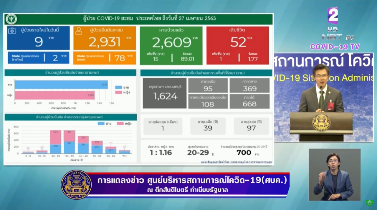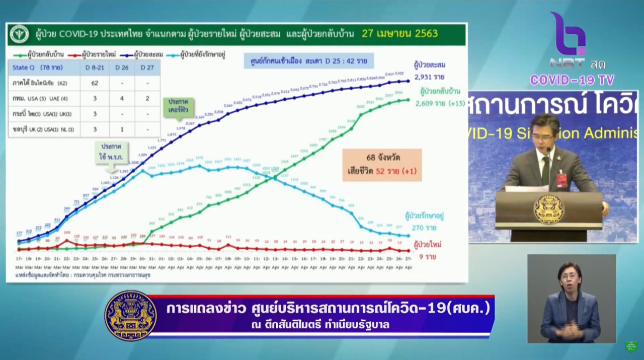 เมื่อเวลา 12.30 น. วันที่ 27 เม.ย. 2563 นายแพทย์ทวีศิลป์ วิษณุโยธิน โฆษกศูนย์บริหารสถานการณ์การแพร่ระบาดของโรคติดเชื้อไวรัสโคโรนา 2019 (โควิด-19) หรือ ศบค. แถลงสถานการณ์การระบาดของไวรัสโควิด-19 ในประเทศไทย ภายหลัง พล.อ.ประยุทธ์ จันทร์โอชา นายกรัฐมนตรีและรัฐมนตรีว่าการกระทรวงกลาโหม ในฐานะผู้อำนวยการ ศบค. ร่วมประชุม ศบค.ชุดใหญ่