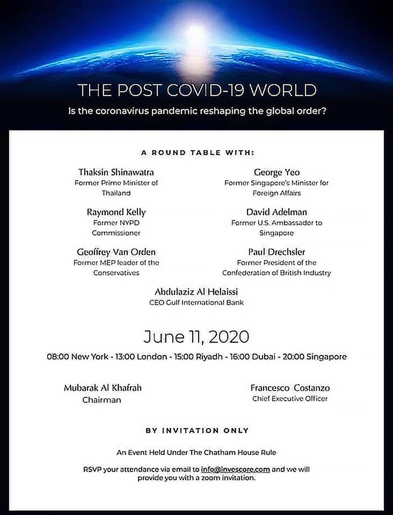 วันที่ 8 มิ.ย. 2563 มีรายงานว่า นายทักษิณ ชินวัตร อดีตนายกรัฐมนตรี มีชื่อปรากฏในฐานะผู้ร่วมงานเสวนาแบบทางไกลผ่านโปรแกรมซูม (zoom) ในเวทีโลก โดยได้รับเชิญให้ร่วมวิเคราะห์การปรับตัวทางเศรษฐกิจและธุรกิจของโลก หลังสถานการณ์การระบาดโควิด-19 ในหัวข้อ THE POST COVID-19 WORLD is the coronavirus pandemic reshaping the global order? ทั้งนี้ นอกจาก นายทักษิณ ยังมีอีก 6 รายชื่อร่วมเสวนาด้วย
