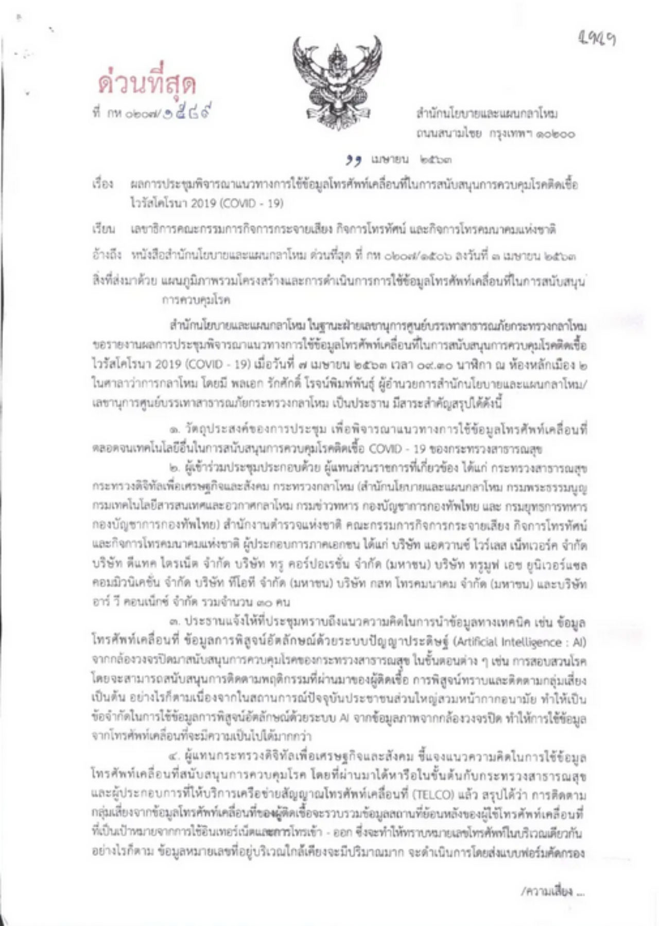 จากกรณีโลกโซเชียล แชร์ข้อความจากผู้ใช้เฟซบุ๊ก "Sarinee Achavanuntakul - สฤณี อาชวานันทกุล" ระบุว่ามีคนส่งเอกสารชุดนี้มาให้ อ้างเป็นหนังสือจากกระทรวงกลาโหมถึง กสทช. และหนังสือจากกรมควบคุมโรคถึง กสทช. ขอให้ผู้ให้บริการโทรศัพท์มือถือ ส่งข้อมูลตำแหน่งสัญญาณโทรศัพท์เคลื่อนที่ย้อนหลัง 14 วัน ของผู้ติดเชื้อรายใหม่ รวมถึงข้อมูลเบอร์โทรศัพท์ของทุกคนที่เคยอยู่ในบริเวณเดียวกันกับผู้ติดเชื้อ เพื่อส่ง SMS แจ้งเตือน และเพื่อดำเนินการสอบสวนโรค ทั้งหมดนี้อ้างอำนาจตาม พ.ร.บ.ควบคุมโรค ประกอบ พ.ร.ก.ฉุกเฉิน