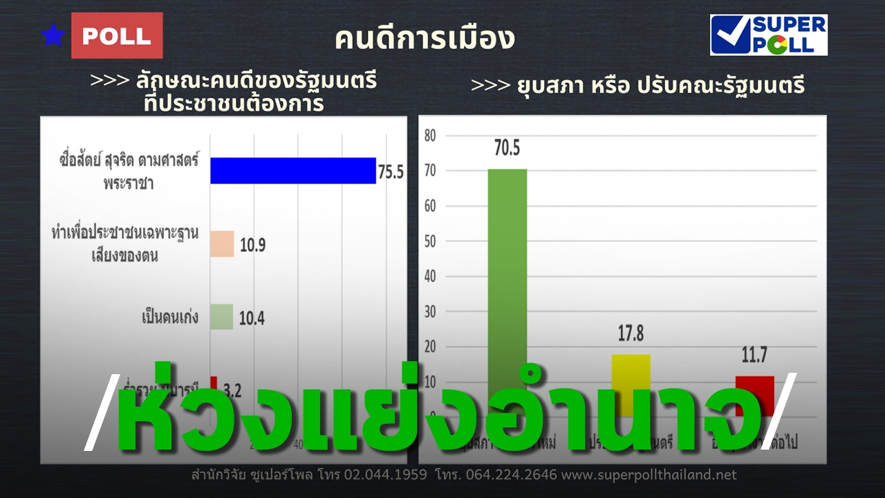 ซูเปอร์โพล ชี้ คนกว่า 75% ระบุ "ซื่อสัตย์ สุจริต" คือ คนดีการเมือง ที่อยากให้ "บิ๊กตู่" มีไว้ใกล้ตัว ขณะ 78% ห่วง แย่งตำแหน่ง เป็น "น้ำผึ้งหยดเดียว" ทำรัฐบาลแตกแยก ชี้ ยุบสภาเลือกตั้งใหม่ คือ คำตอบ ขอผู้ใหญ่ในรัฐบาลอย่าเป็นต้นตอความวุ่นวายเสียเอง