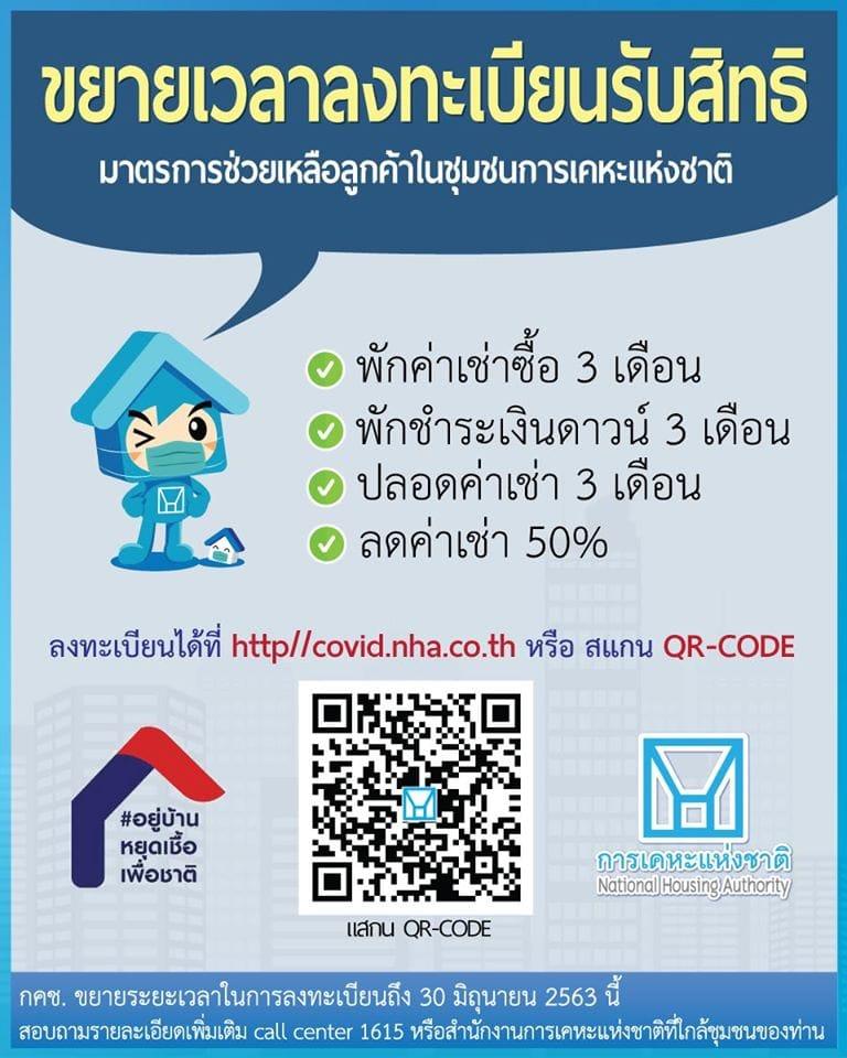 วันที่ 18 มิ.ย. น.ส.รัชดา ธนาดิเรก รองโฆษกรัฐบาล โพสต์เฟซบุ๊ก รัชดา ธนาดิเรก แจง การเคหะแห่งชาติ ขยายเวลารับสิทธิ์ ตามมาตรการช่วยเหลือลูกค้าที่กระทบจากโควิด-19 ออกไปจนถึงวันที่ 30 มิ.ย.นี้ ทั้งกลุ่มลูกค้าผ่อนดาวน์ เช่าซื้อ เช่าอาคารและที่ดิน ผู้เช่าแผง ผู้เช่าเหมาอาคารและตลาด และผู้ประกอบการ ซึ่งมีมาตรการช่วยเหลือ คือ