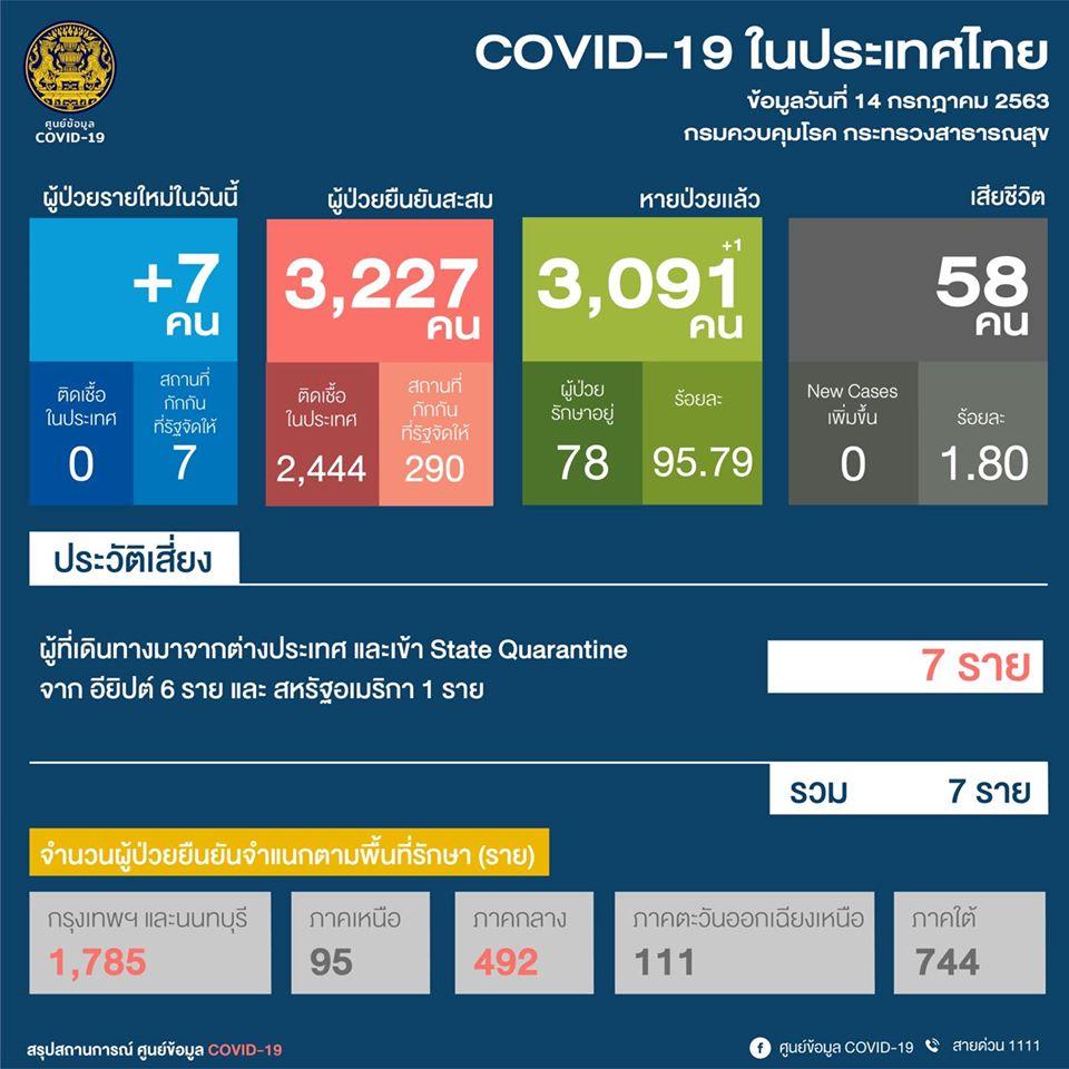 เมื่อเวลา 11.30 น. วันที่ 14 ก.ค. 2563 นายแพทย์ทวีศิลป์ วิษณุโยธิน โฆษกศูนย์ ศบค. รายงานสถานการณ์ผู้ติดเชื้อไวรัสโคโรนา 2019 หรือโควิด-19 ในประเทศไทย โดยมีรายละเอียดดังนี้