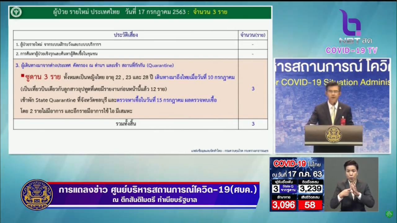 เมื่อเวลา 11.30 น. วันที่ 17 ก.ค. 2563 นายแพทย์ทวีศิลป์ วิษณุโยธิน โฆษกศูนย์บริหารสถานการณ์การแพร่ระบาดของโรคติดเชื้อไวรัสโคโรนา 2019 (โควิด-19) หรือ ศบค. แถลงสถานการณ์ประจำวันที่ทำเนียบรัฐบาล โดยมีรายงานดังนี้