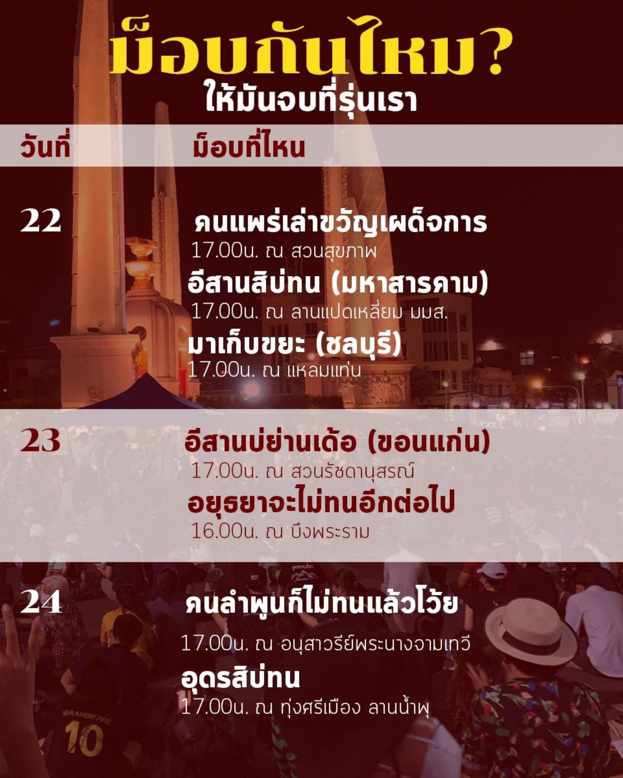 วันที่ 21 ก.ค. 2563 ผู้สื่อข่าวรายงานว่า แฟนเพจเฟซบุ๊ก สหภาพนักเรียน นิสิต นักศึกษาแห่งประเทศไทย - Student Union of Thailand นำโดย น.ส.จุฑาทิพย์ ศิริขันธ์ นักศึกษามหาวิทยาลัยธรรมศาสตร์ ประธานสหภาพนักเรียน นิสิต นักศึกษาแห่งประเทศไทย (สนท.) แจ้งว่า ขณะนี้มีเครือข่ายเยาวชนตลอดจนนักศึกษาในจังหวัดต่างๆ เริ่มนัดหมายรวมตัวจัดกิจกรรมขับไล่รัฐบาลในแบบแฟลชม็อบ กระจายไปในหลายจังหวัด อาทิ
