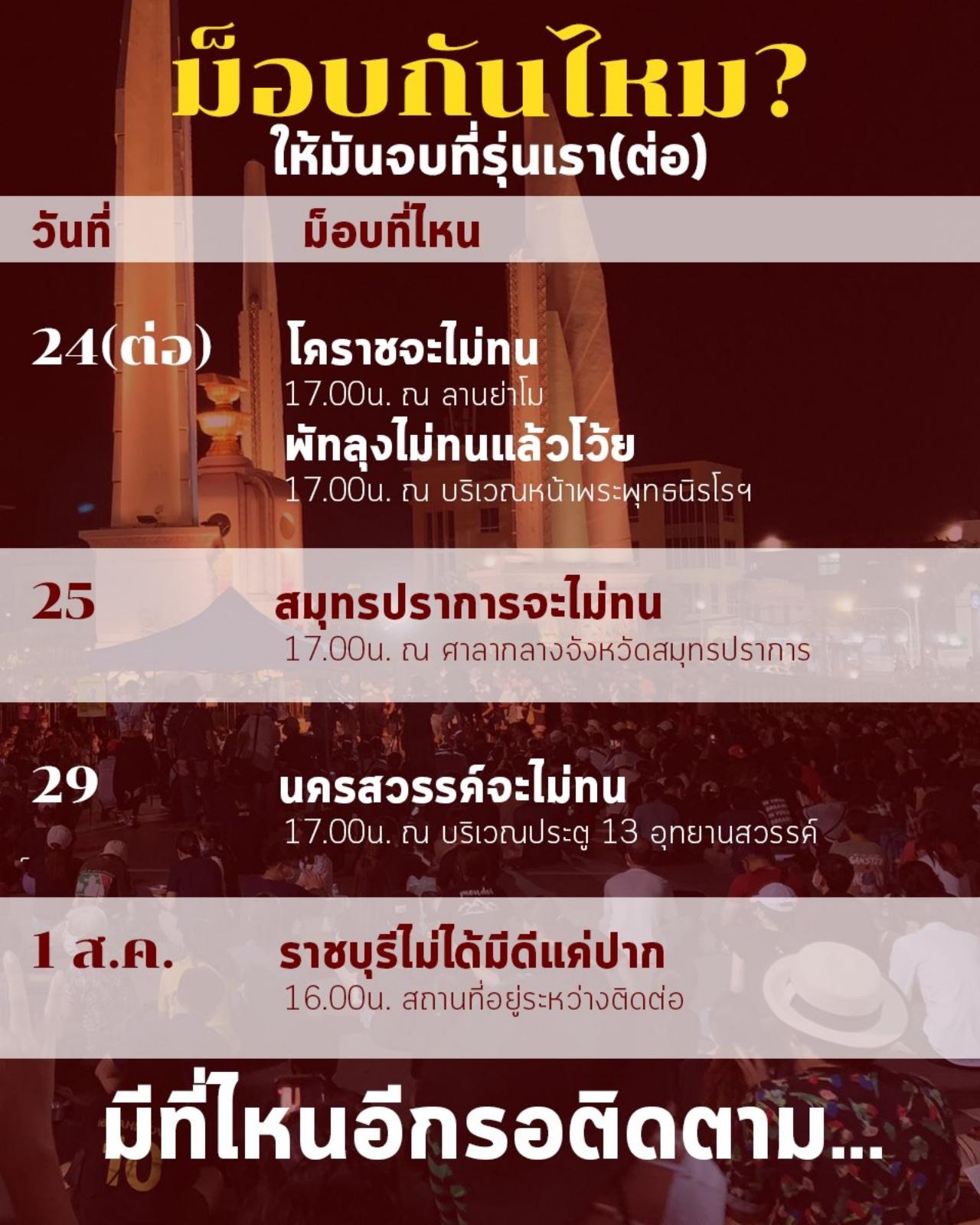 สหภาพนักเรียน นิสิต นักศึกษาแห่งประเทศไทย เผยตารางกิจกรรมม็อบหลายจังหวัดทั่วประเทศ ตั้งแต่พรุ่งนี้ - 1 ส.ค. 63