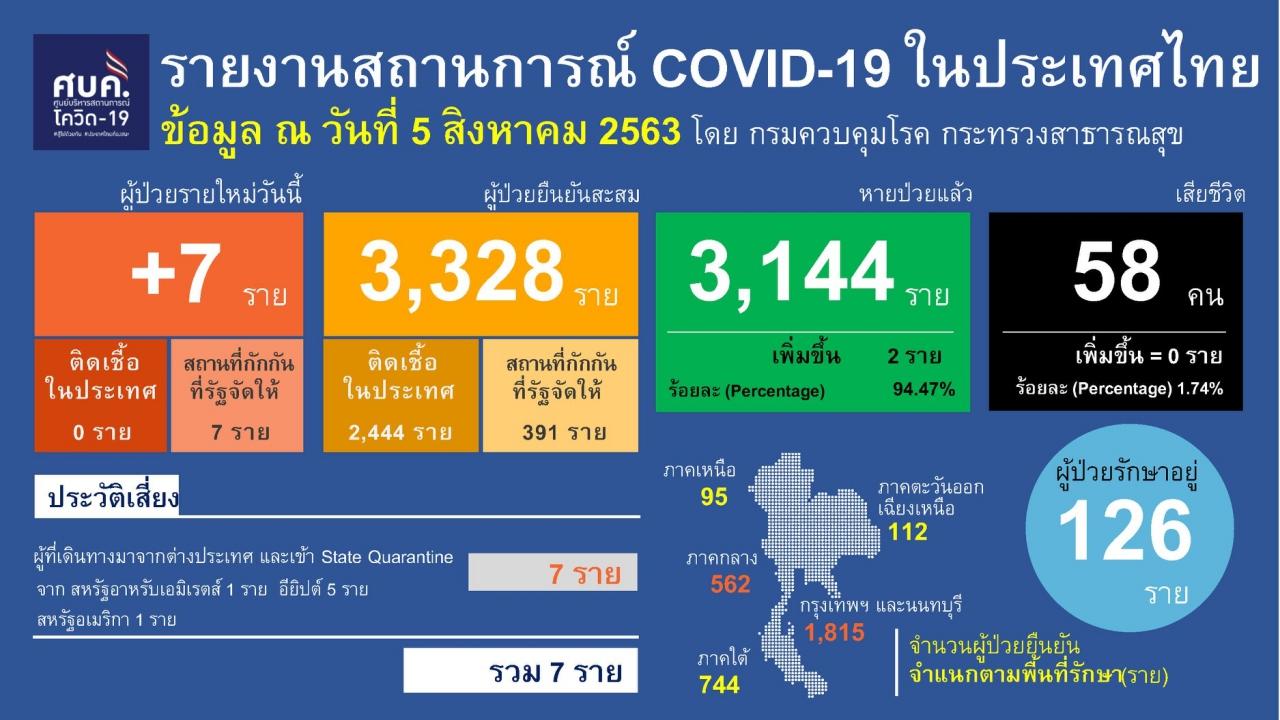 เมื่อเวลา 11.30 น. วันที่ 5 ส.ค. 2563 แพทย์หญิงพรรณประภา ยงค์ตระกูล ผู้ช่วยโฆษกศูนย์บริหารสถานการณ์การแพร่ระบาดของโรคติดเชื้อไวรัสโคโรนา 2019 (โควิด-19) หรือ ศบค. แถลงสถานการณ์ประจำวันที่กระทรวงสาธารณสุข มีรายงานดังนี้