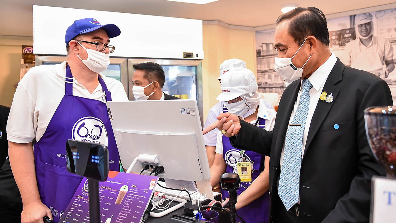 พล.อ.ประยุทธ์ จันทร์โอชา นายกรัฐมนตรี เยี่ยมชมซักถามพูดคุยกับพนักงานร้านกาแฟผู้พิการอย่างเป็นกันเอง ระหว่างเป็นประธานพิธีเปิดร้านกาแฟ APCD 60+Plus Bakery&Chocolate Cafe@ทำเนียบรัฐบาล ที่อยู่หลังตึกนารีสโมสร เพื่อส่งเสริมสร้างรายได้ให้คนพิการ.