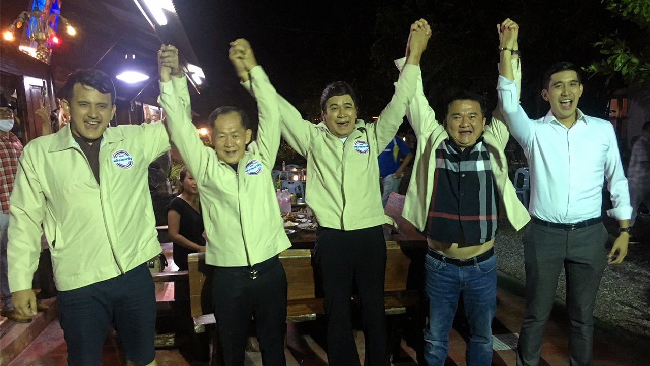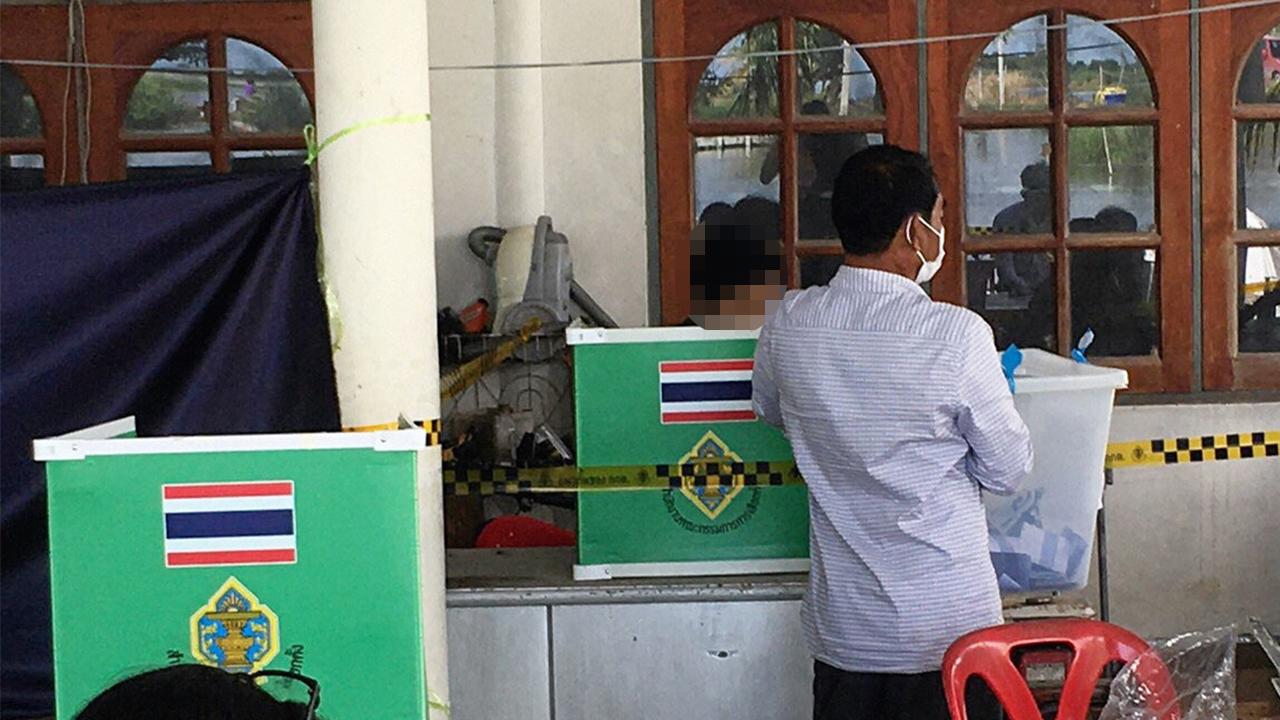 นายกรุงศรีวิไล สุทินเผือก ผู้สมัครเลือกตั้งซ่อม ส.ส.สมุทรปราการ เขต 5 พร้อมทีมงานยกมือยิ้มร่า หลังปิดหีบนับคะแนนนำคู่แข่งเท่าตัวป้องกันแชมป์ได้สำเร็จ ขณะที่เจ้าหน้าที่หน่วยเลือกตั้งที่ 37 อ.บางบ่อ ยกหีบเลือกตั้งให้คนมีไข้สูง โดย กกต.ชี้แจงเป็นมาตรการป้องกันโควิด-19.