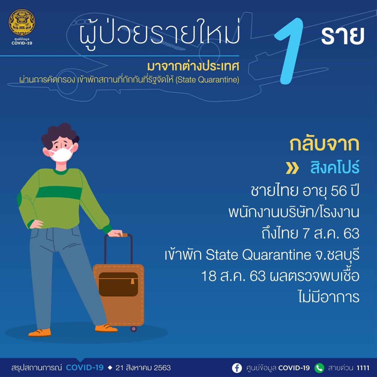 เมื่อเวลา 11.30 น. วันที่ 21 ส.ค. 2563 นายแพทย์ทวีศิลป์ วิษณุโยธิน โฆษกศูนย์บริหารสถานการณ์การแพร่ระบาดของโรคติดเชื้อไวรัสโคโรนา 2019 (โควิด-19) หรือ ศบค. แถลงสถานการณ์ประจำวันที่ทำเนียบรัฐบาล ซึ่งห่างหายการแถลงข่าว ณ ที่แห่งนี้กันราว 20 วัน ภายหลังการประชุม ศบค.ชุดใหญ่ โดยมี พล.อ.ประยุทธ์ จันทร์โอชา นายกรัฐมนตรี ในฐานะผู้อำนวยการ ศบค. เป็นประธานการประชุม ซึ่งรายงานผู้ป่วยประจำวันมีดังนี้
