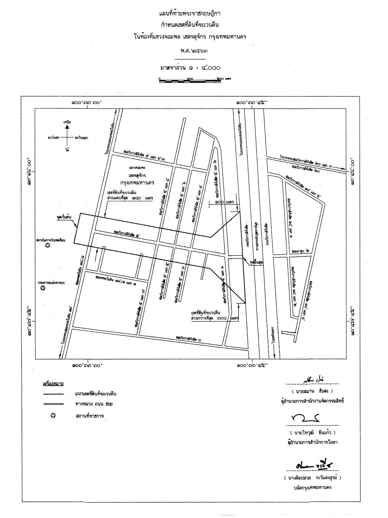 มาตรา 1 พระราชกฤษฎีกานี้เรียกว่า “พระราชกฤษฎีกากำหนดเขตที่ดินที่จะเวนคืน ในท้องที่แขวงจอมพล เขตจตุจักร กรุงเทพมหานคร พ.ศ.2563”