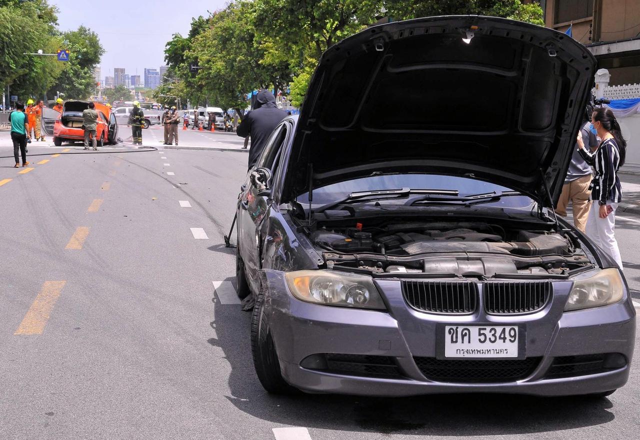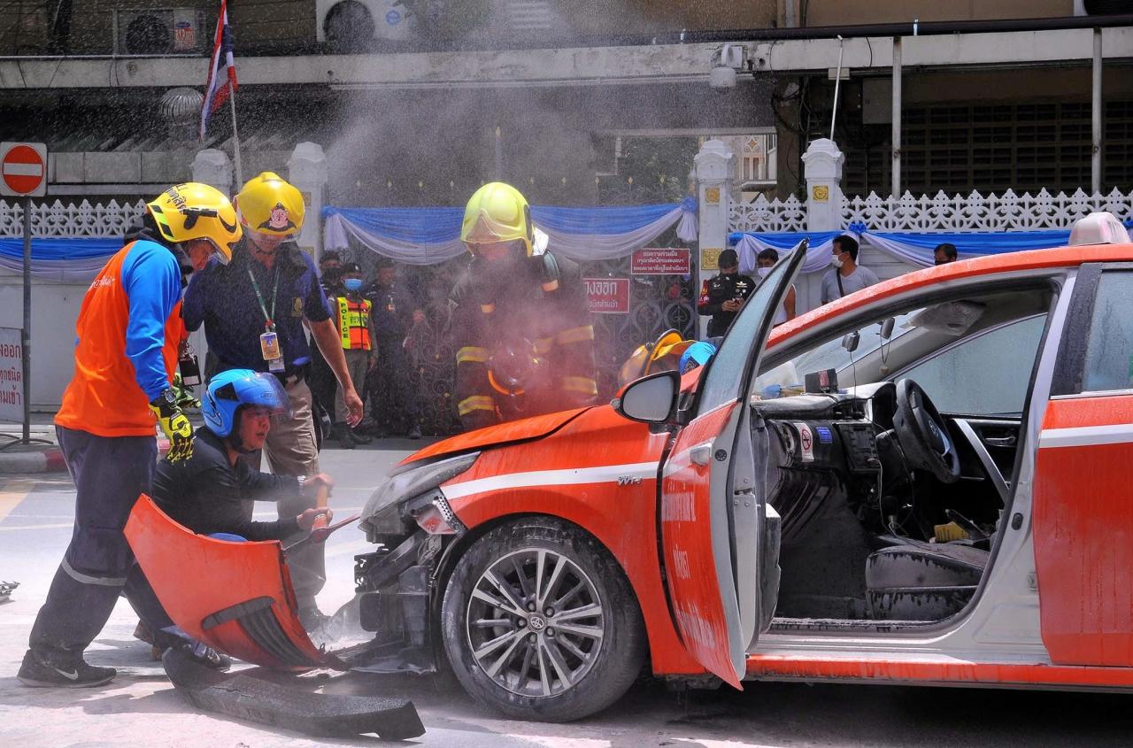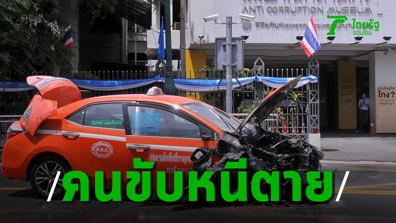 คนขับแท็กซี่ติดแก๊สหนีตายระทึก หลังเฉี่ยวชนกับบีเอ็มดับเบิลยู จนรถเกิดไฟลุกท่วมข้างทำเนียบรัฐบาล พลเมืองดีผ่านมารีบนำถังดับเพลิงช่วยฉีดดับ