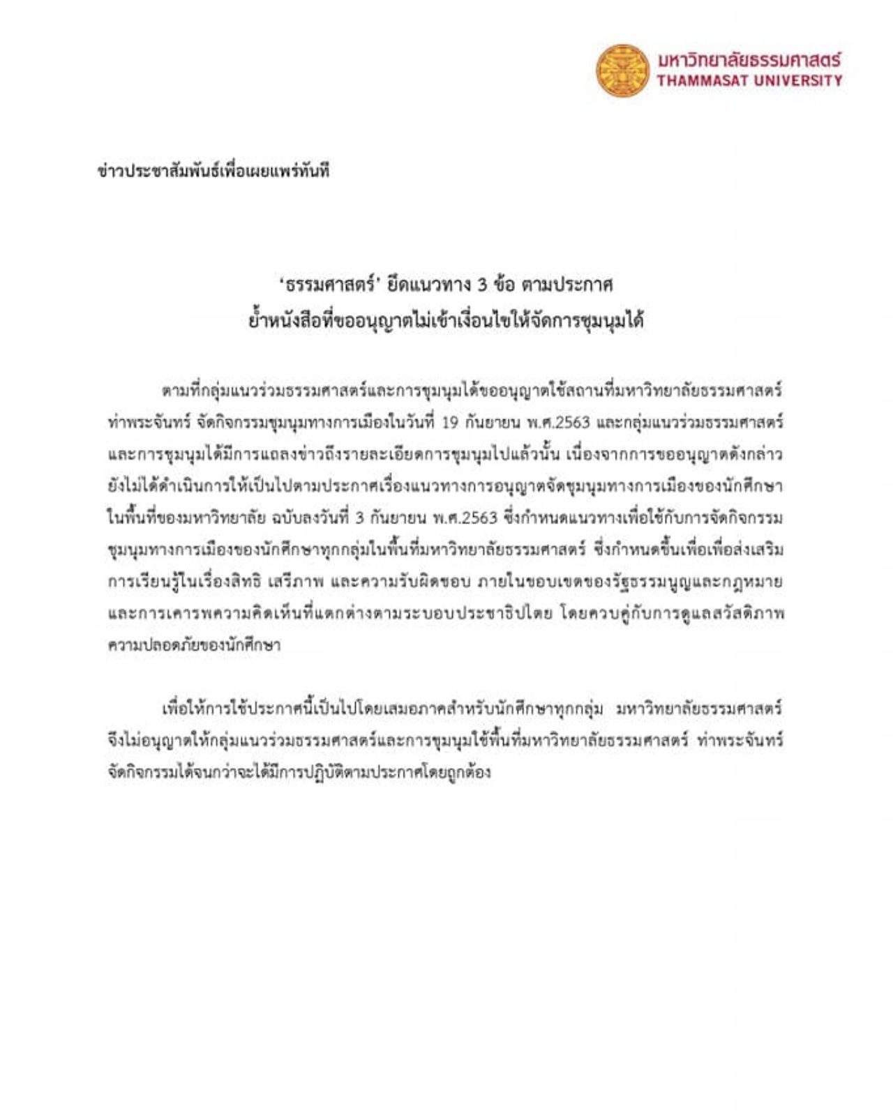 ทั้งนี้ มหาวิทยาลัยธรรมศาสตร์ ได้ออกหนังสือ ยืนยัน ยึดแนวทาง 3 ข้อตามประกาศ ย้ำหนังสือที่ขออนุญาตของกลุ่มแนวร่วมธรรมศาสตร์และการชุมนุมไม่เข้าเงื่อนไขให้ใช้พื้นที่จัดการชุมนุมได้