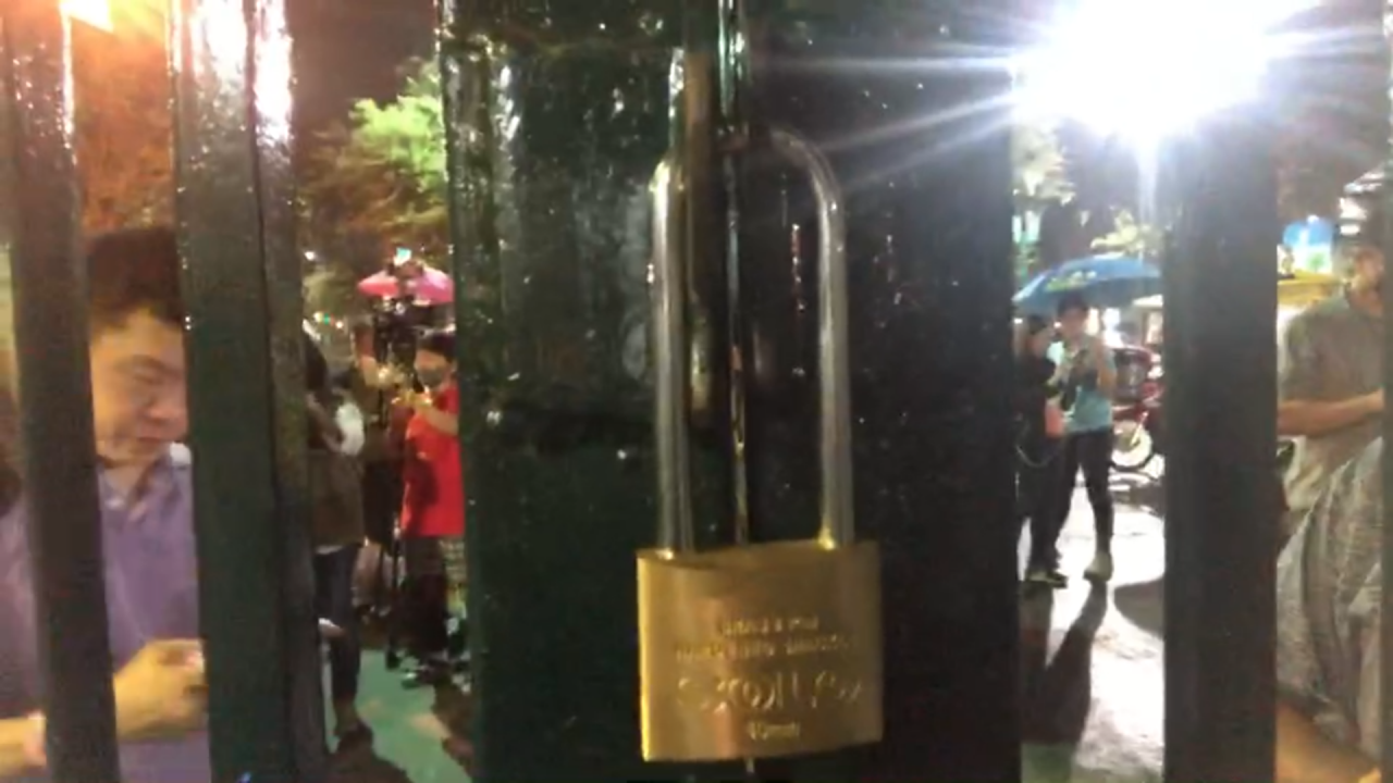 เจ้าหน้าที่ปิดประตู มหาวิทยาลัยธรรมศาสตร์ ท่าพระจันทร์ พร้อมคล้องแม่กุญแจแล้ว จับตาความเคลื่อนไหวม็อบ 19 ก.ย. จะทำอย่างไรในวันพรุ่งนี้