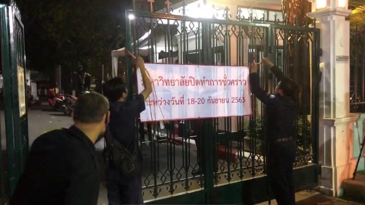 ช่วงค่ำวันที่ 18 ก.ย. 2563 บรรยากาศที่หน้ามหาวิทยาลัยธรรมศาสตร์ ท่าพระจันทร์ ที่มีนักศึกษาและบุคลากรทยอยเดินออกมา แต่กลับมีรถจักรยานยนต์ขับขี่เข้ามาจอดในมหาวิทยาลัย โดยมีการตั้งข้อสังเกตว่ากลุ่มคนดังกล่าวเป็นชายตัดผมเกรียนกระทั่งเวลา 20.07 น. เจ้าหน้าที่ดำเนินการปิดประตูมหาวิทยาลัยธรรมศาสตร์ และมีการคล้องแม่กุญแจเป็นที่เรียบร้อยแล้ว แต่ไม่ได้มีการคล้องโซ่แต่อย่างใด โดยมีสื่อมวลชนและประชาชนยืนสังเกตการณ์อยู่จำนวนหนึ่ง ทั้งนี้ ที่รั้วประตูเจ้าหน้าที่นำป้ายมาคล้องมีข้อความระบุว่า "มหาวิทยาลัยปิดทำการชั่วคราว ระหว่างวันที่ 18-20 กันยายน 2563"