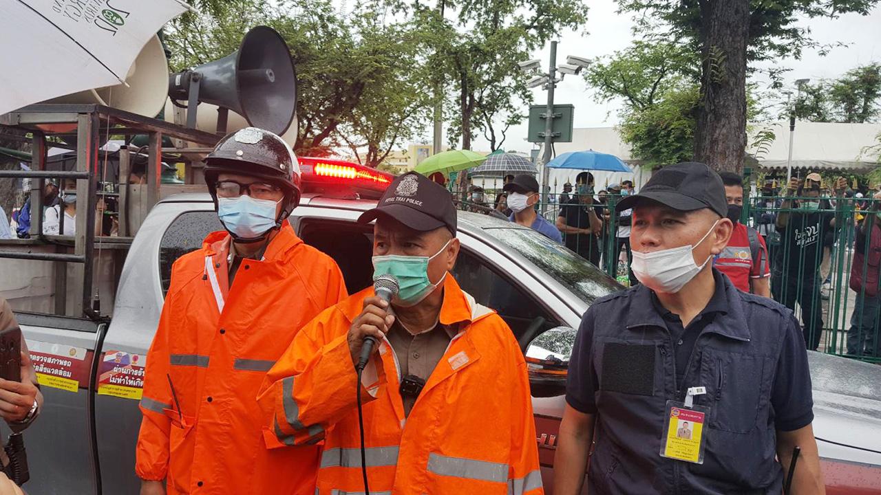 - ต่อมา พ.ต.อ.วรศักดิ์ พิสิษฐบรรณกร ผกก. สน.ชนะสงคราม นำรถขยายเสียงมาจอดหน้ามหาวิทยาลัยธรรมศาสตร์ ฝั่งสนามหลวง พร้อมประกาศให้ผู้ชุมนุมทราบว่า การชุมนุมในครั้งนี้อาจจะมีความผิด ทั้งกฎหมายการชุมนุม และ พ.ร.ก.ฉุกเฉิน (อ่านข่าว - คลิกที่นี่)